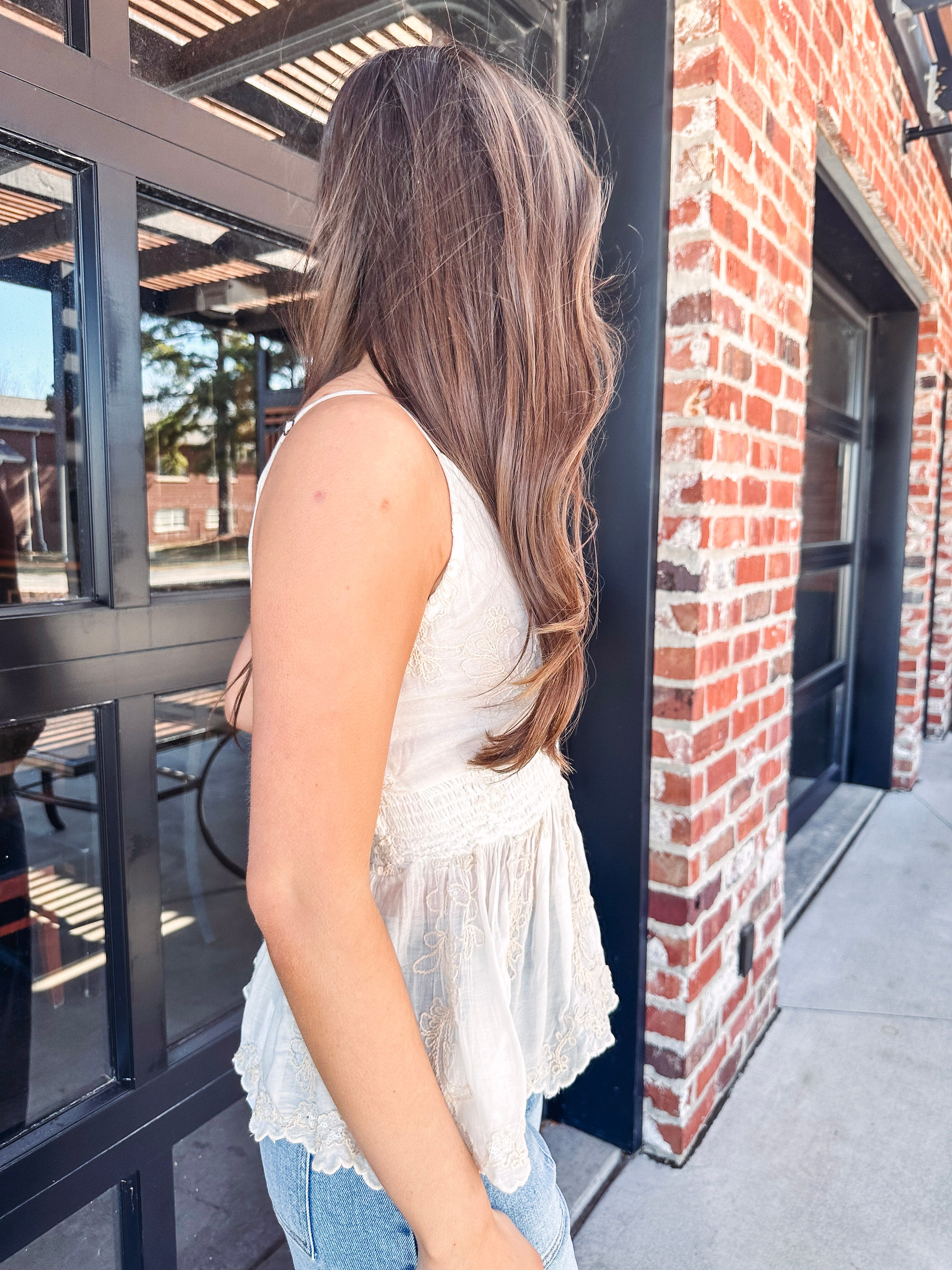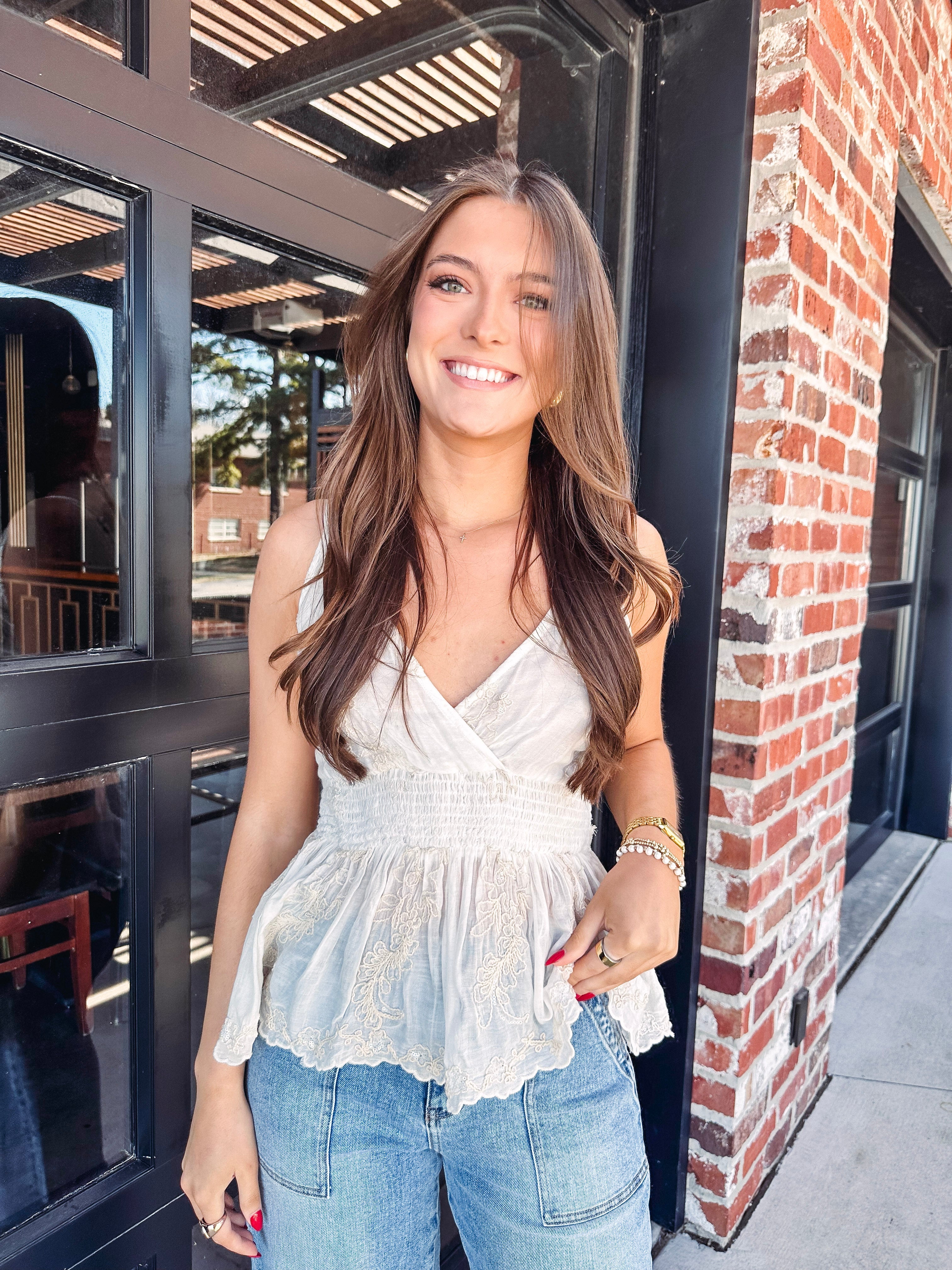 Effortlessly chic and undeniably fun, the Avril Shirred Top brings movement and personality to your everyday wardrobe. This sleeveless beauty features a flattering overlap V-neckline and dreamy flowy silhouette that dances with every step. The delicate smocking detail adds texture and visual interest while keeping things breezy and comfortable. Perfect for layering or wearing solo, it's your go-to piece for looking put-together without trying too hard.