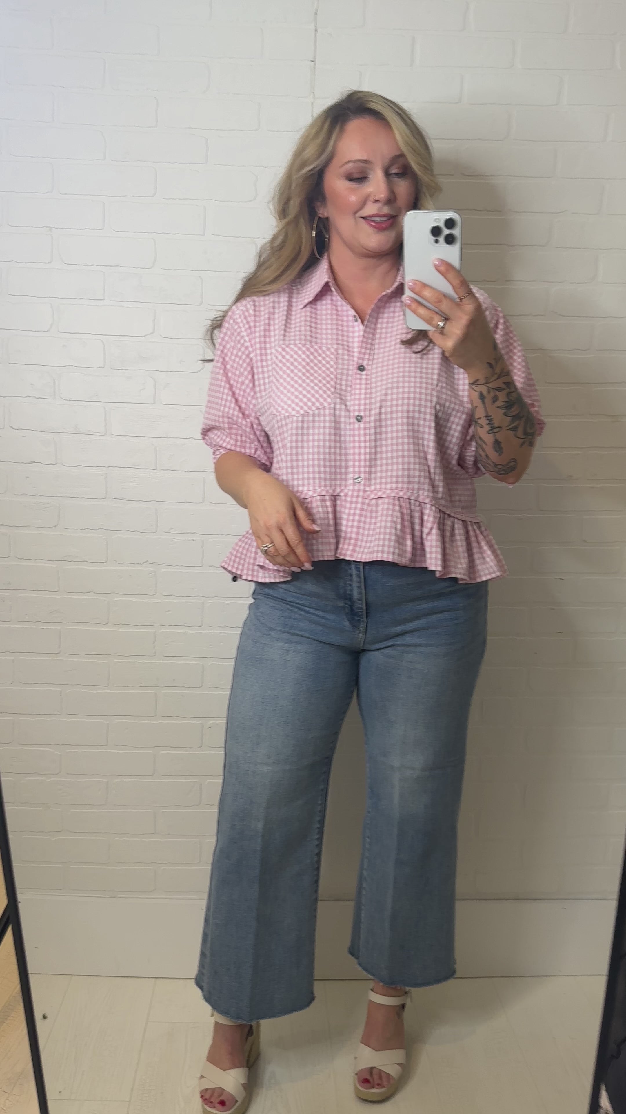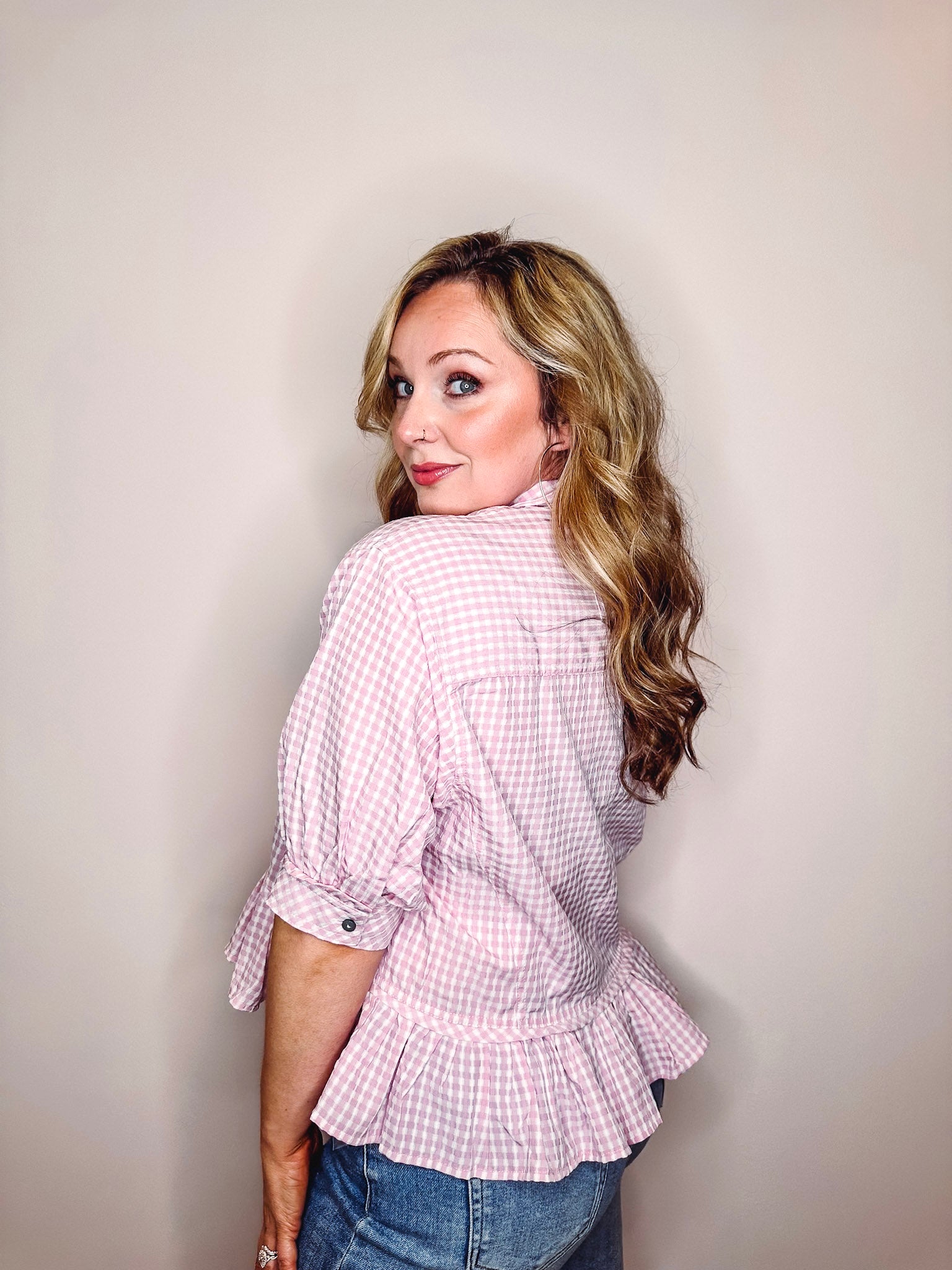 The Daisy Flare Shirt brings cheerful charm to your spring wardrobe with its sweet pink and white check pattern. Puff short sleeves add a touch of whimsy, while the ruffled hem creates flattering movement and playful flair. Whether you're heading to a garden party, brunch, or casual weekend outing, this versatile piece delivers effortless style with personality. Perfect for anyone looking to brighten their seasonal rotation with something fun and feminine.