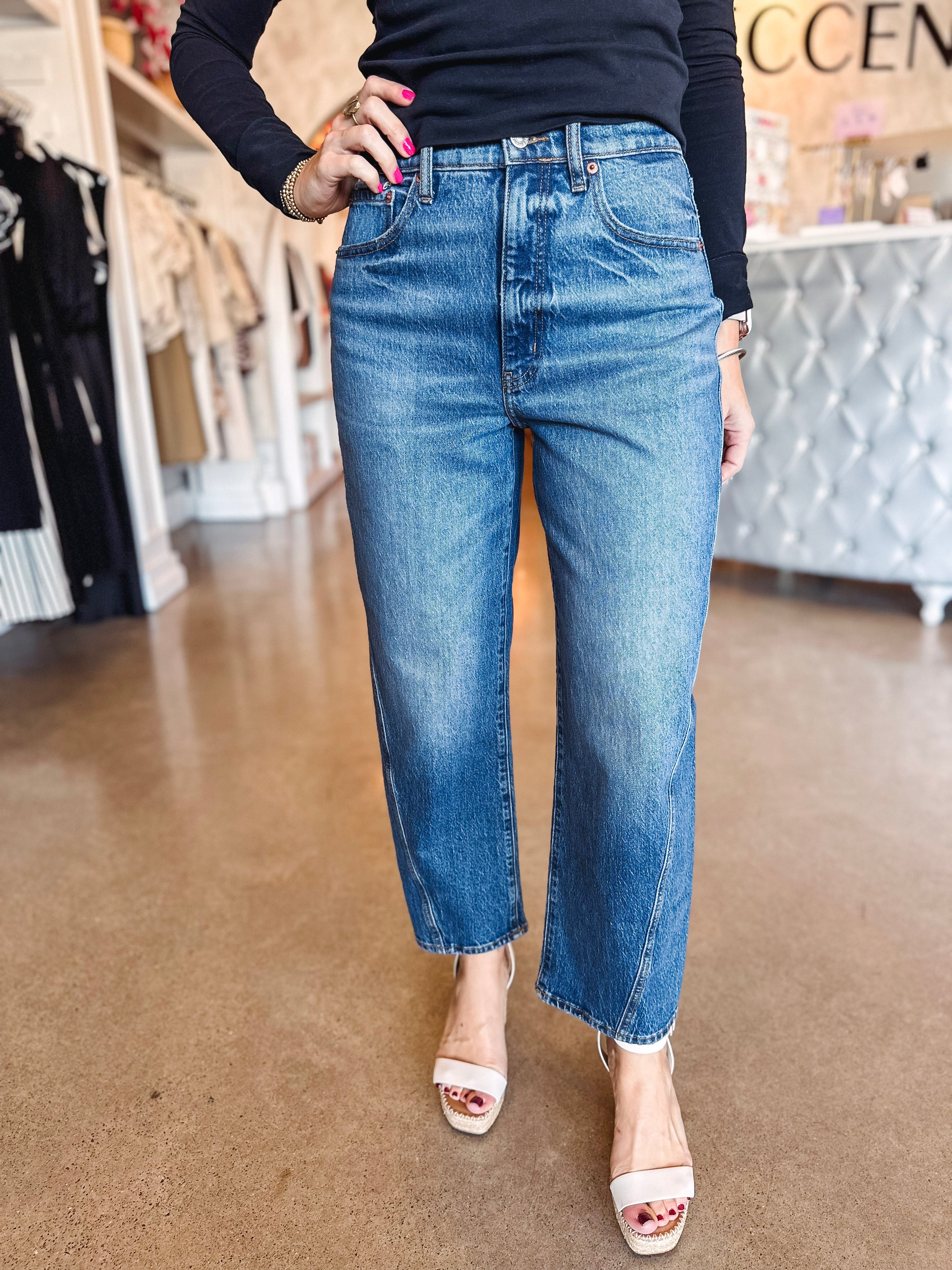 Elevate your denim game with the Daze Denim Westward Barrel Leg jeans—where vintage vibes meet modern sass. With a high-rise cinched waist and playful bowed leg, these jeans hug just right before tapering at the ankle. The dark wash adds mystery, while the Tough Love fabric gives you structure with a comfy stretch that moves like you do. Perfect for dancing through your day or stealing the spotlight wherever you go.