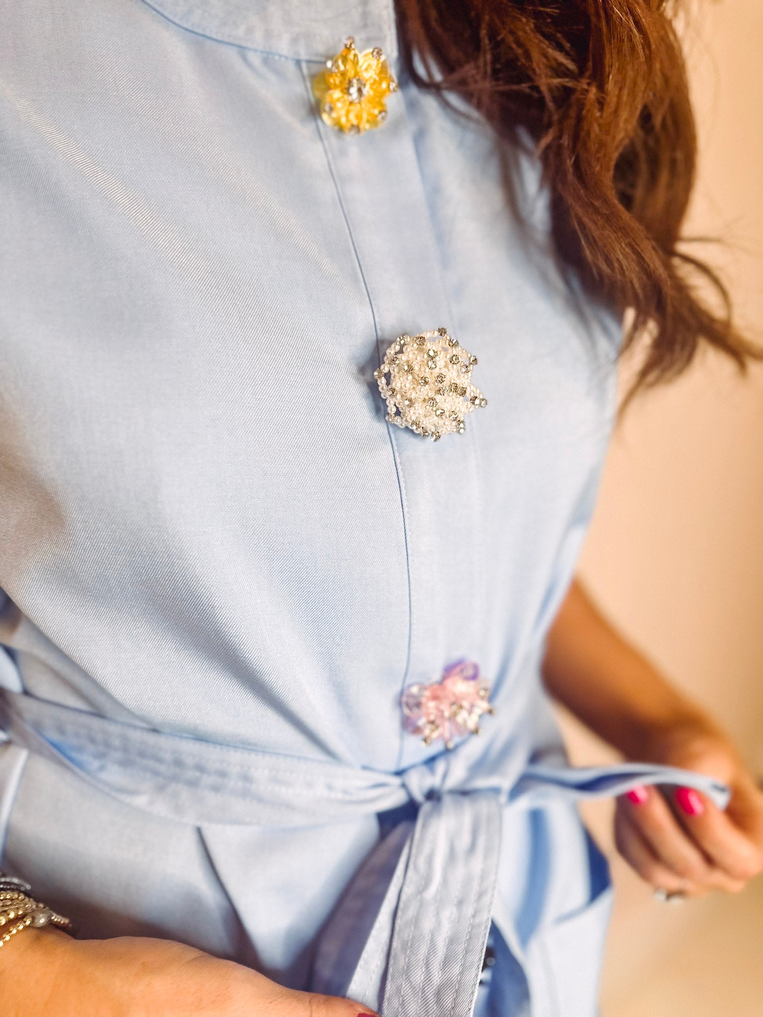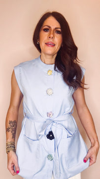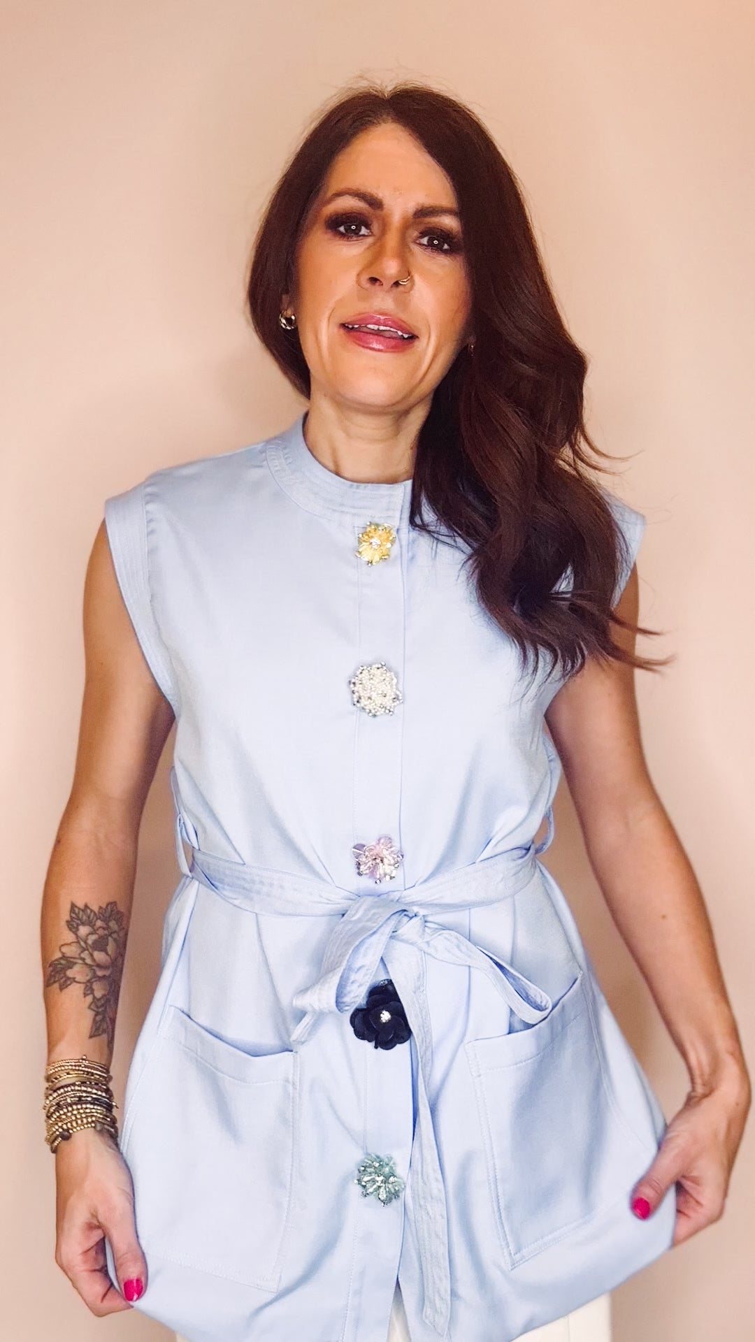 Slip into effortless charm with the Denise Tunic Top, a light blue dream that celebrates individuality. This sleeveless wonder features a playful whimsy button front and a flattering tie waist that lets you customize your silhouette. Perfect for layering or wearing solo, it's the kind of piece that makes getting dressed feel like fun. Versatile enough for casual days and quirky enough to turn heads.
