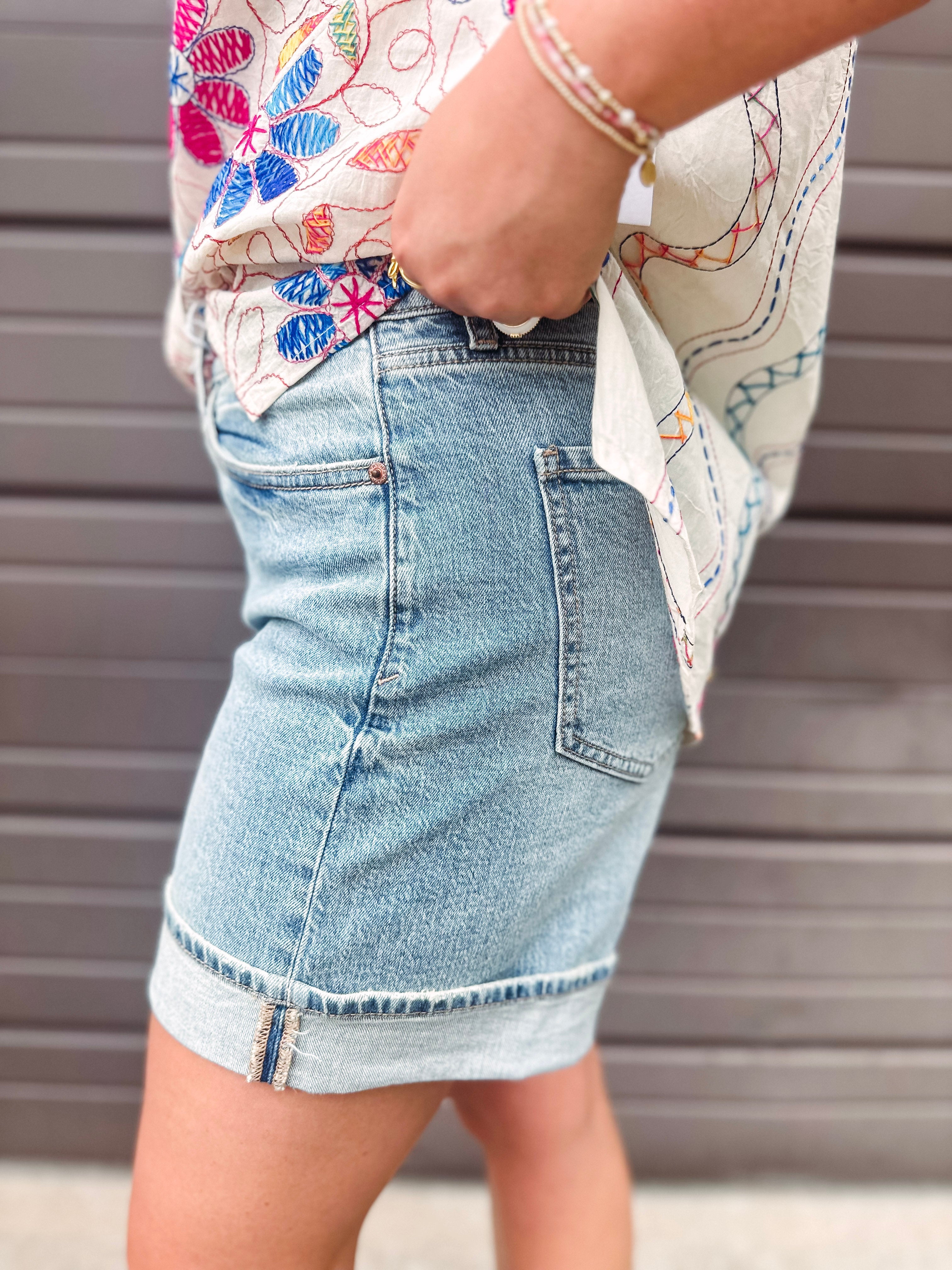 Introducing the Easy Rider Denim Shorts - Dive In Vintage. As easy as it gets, this mid-rise cuff short offers a longer inseam for effortless style. Made with our Tough Love fabric, it's sturdy yet flexible for a perfect fit. Pair it with loafers or flats for a chic look.