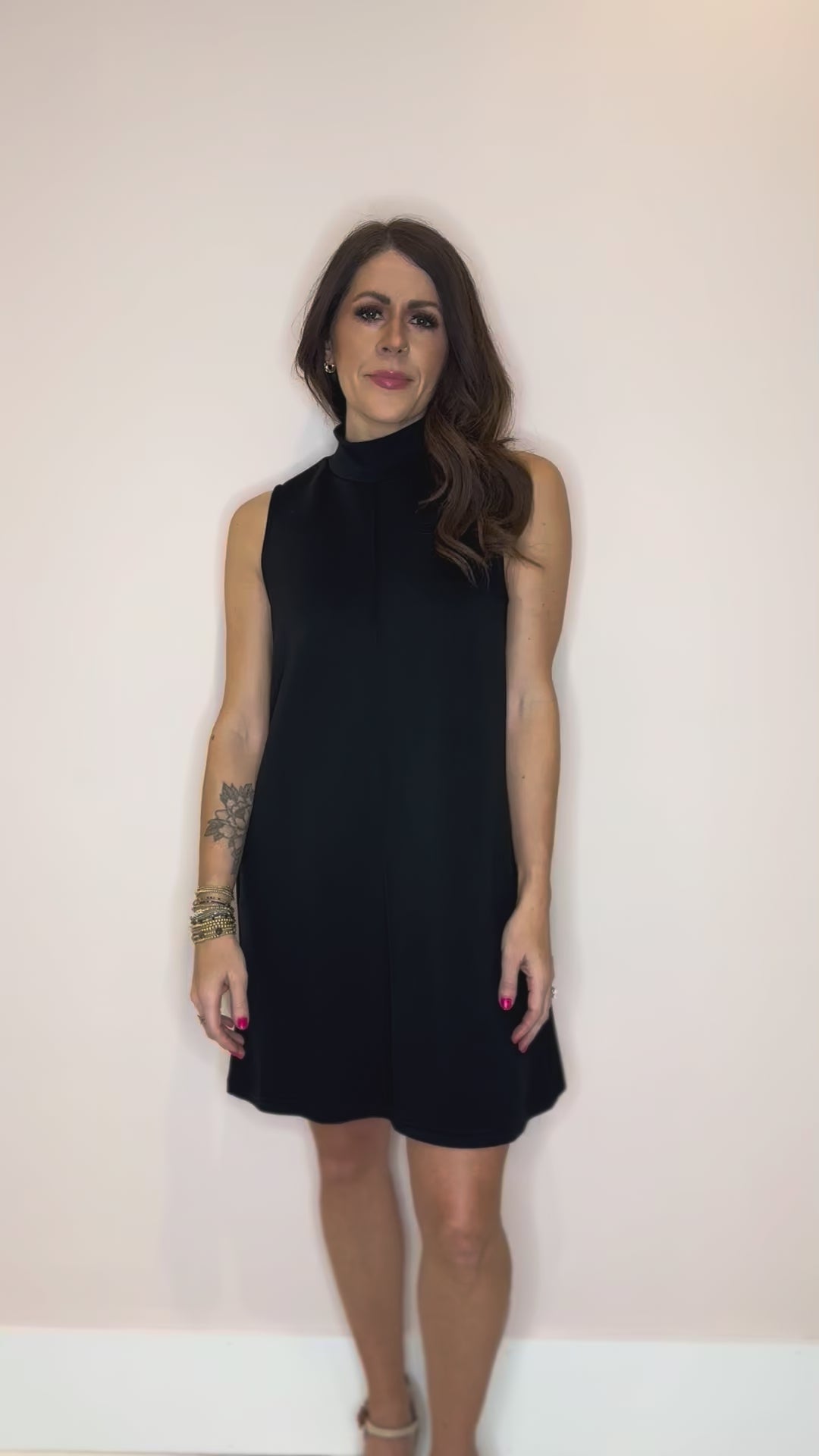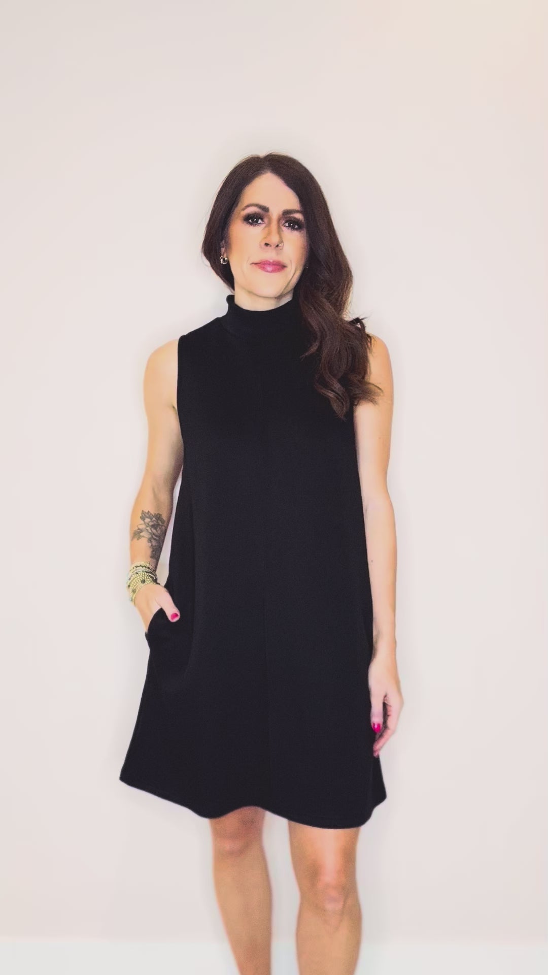 The Edith Shift Dress is your new go-to for effortless elegance. This sleek black shift dress features a chic funnel neckline and flows beautifully to the knee in a relaxed, breezy silhouette. Perfect for everything from casual coffee dates to weekend adventures, the sleeveless design keeps things cool and comfortable while the flowy fabric moves with you. Dress it up with heels or keep it casual with sneakers—this versatile piece does it all.