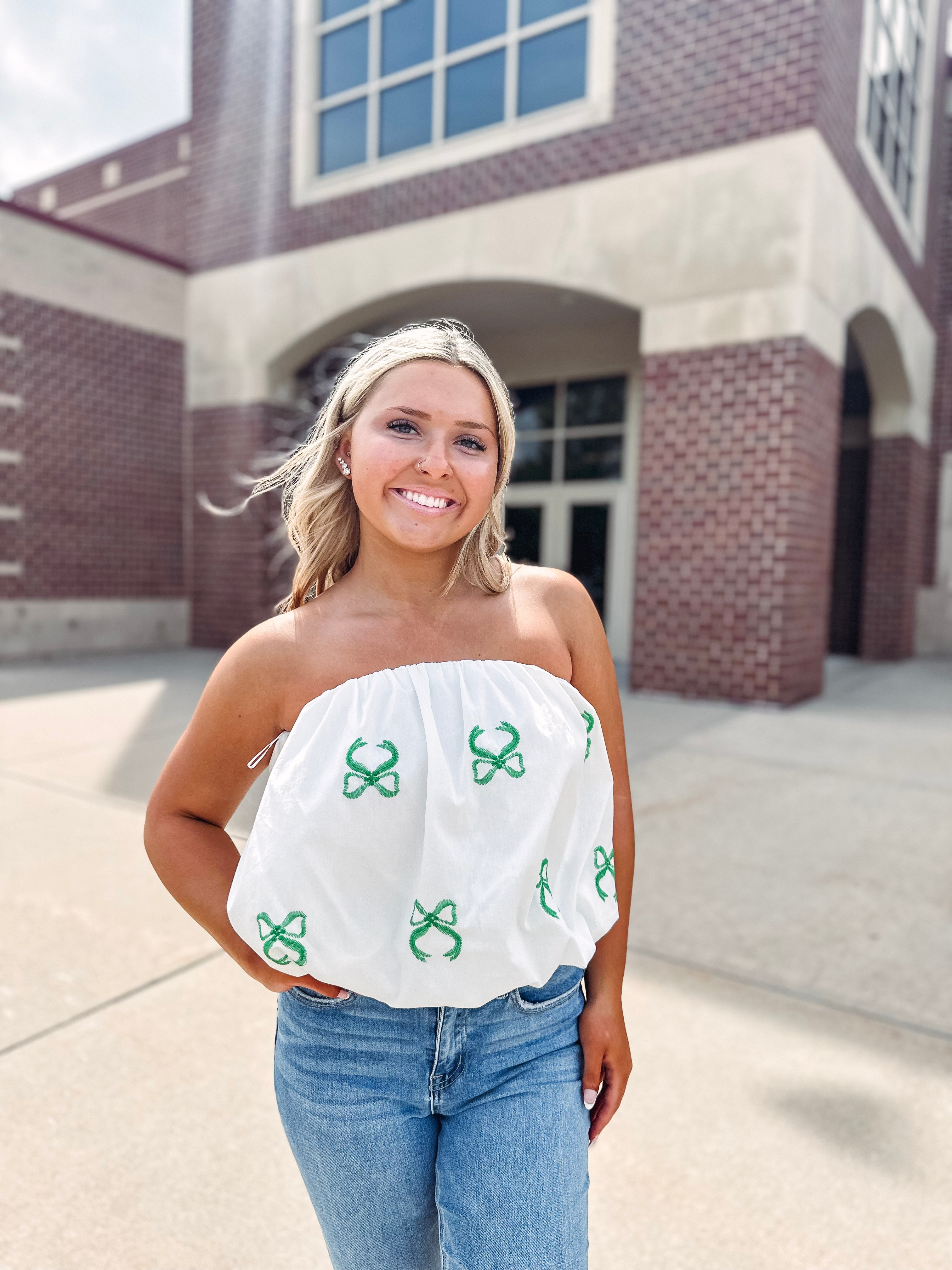 Introducing the Elle Bubble Tube Top! Get ready for some fun and excitement with this crisp white top featuring embroidered kelly green bow details. Hop on the new bubble trend and add a sweet touch to your wardrobe.