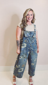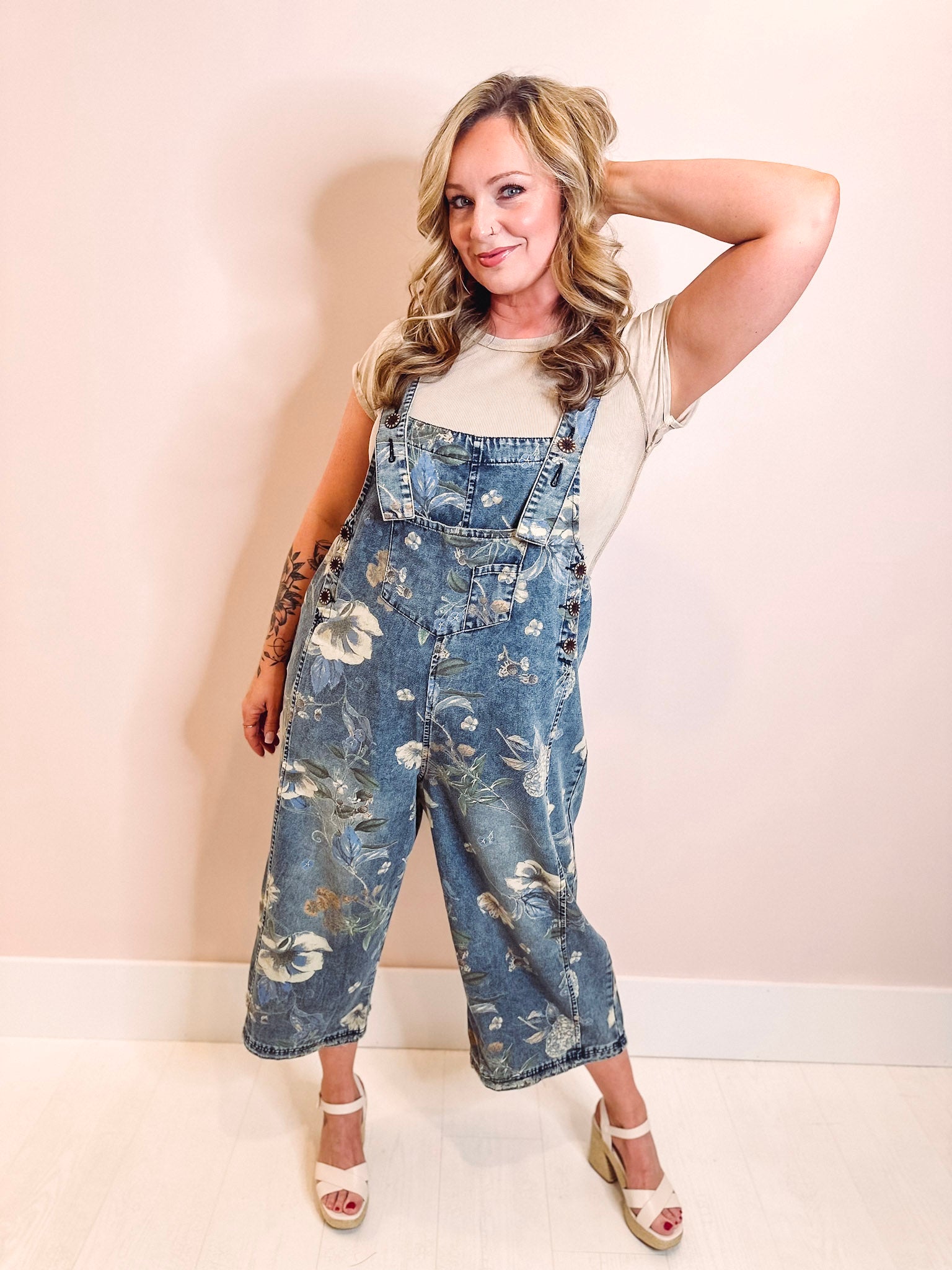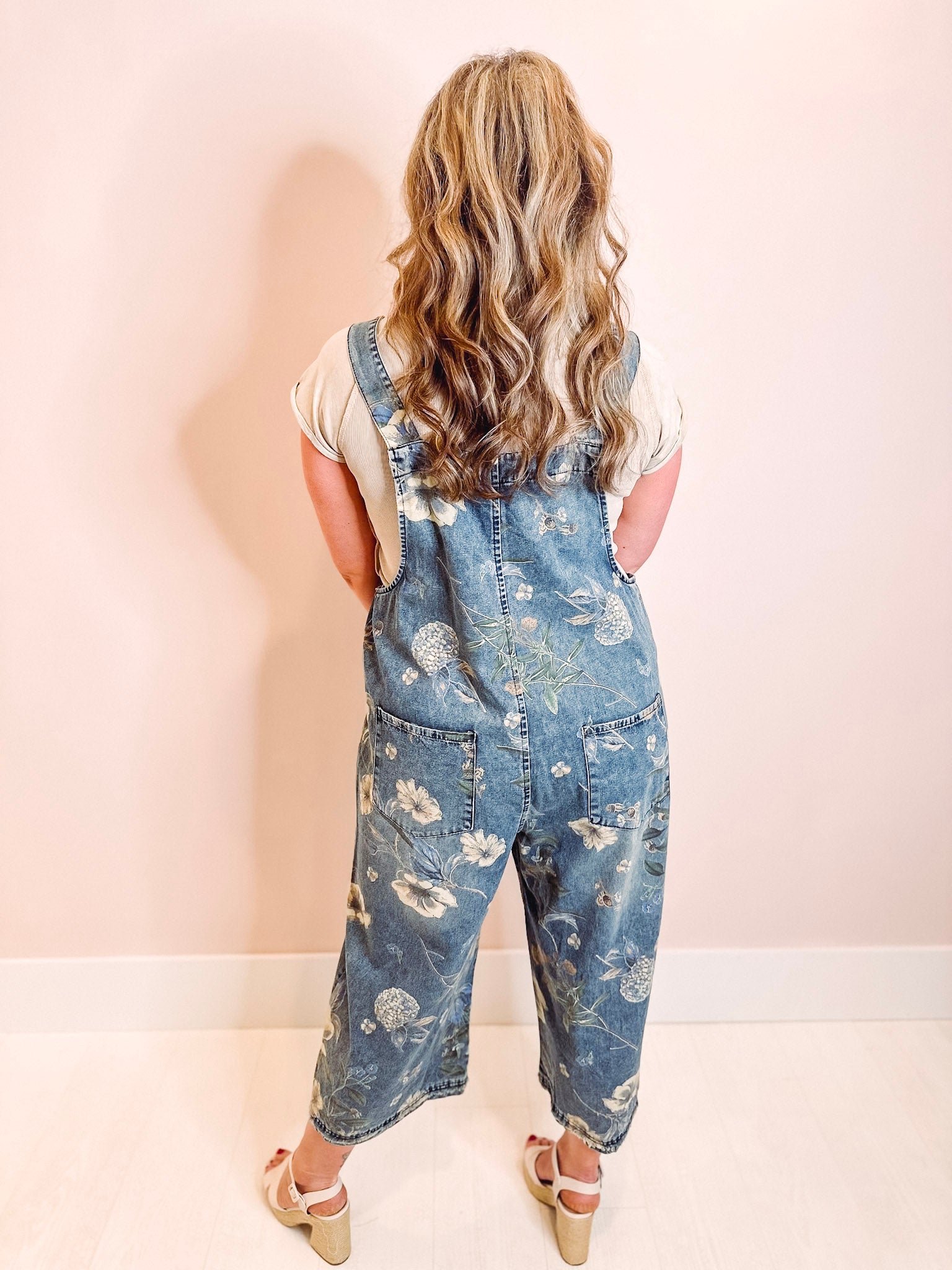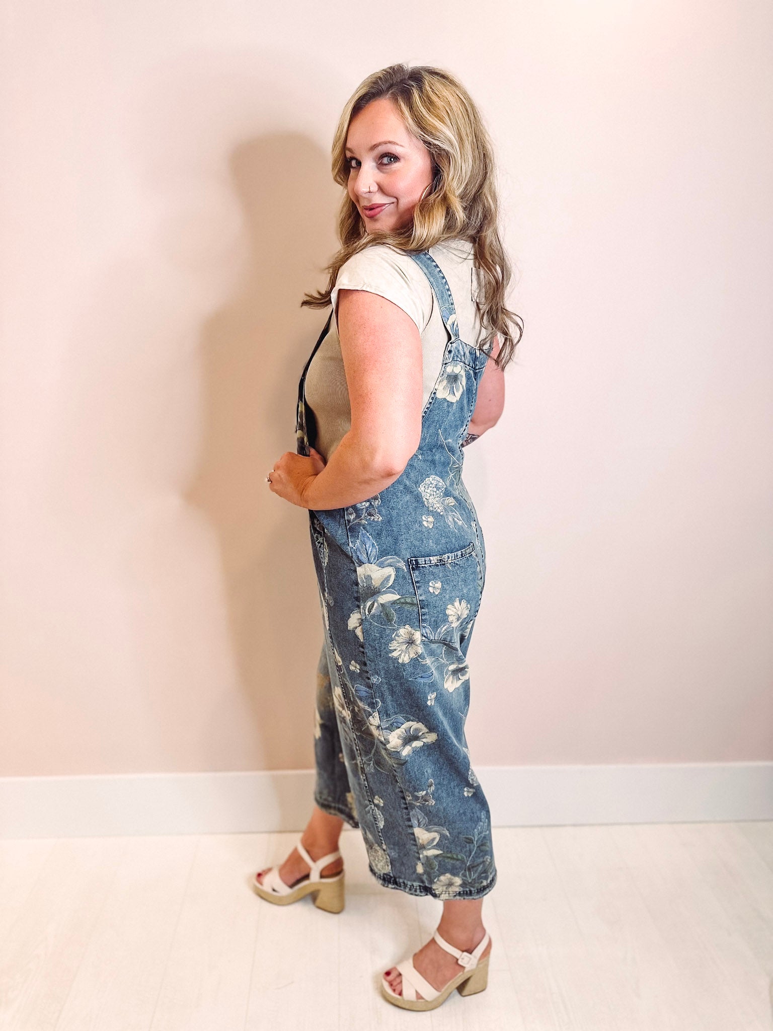 Bloom into style with these charming flower-printed denim overalls. The relaxed wide-leg silhouette offers effortless comfort, while adjustable button-up sides let you customize the fit to perfection. A handy center pocket keeps essentials within reach. Perfect for adding a whimsical touch to your everyday wardrobe, these overalls blend vintage vibes with modern flair for a look that's uniquely you.