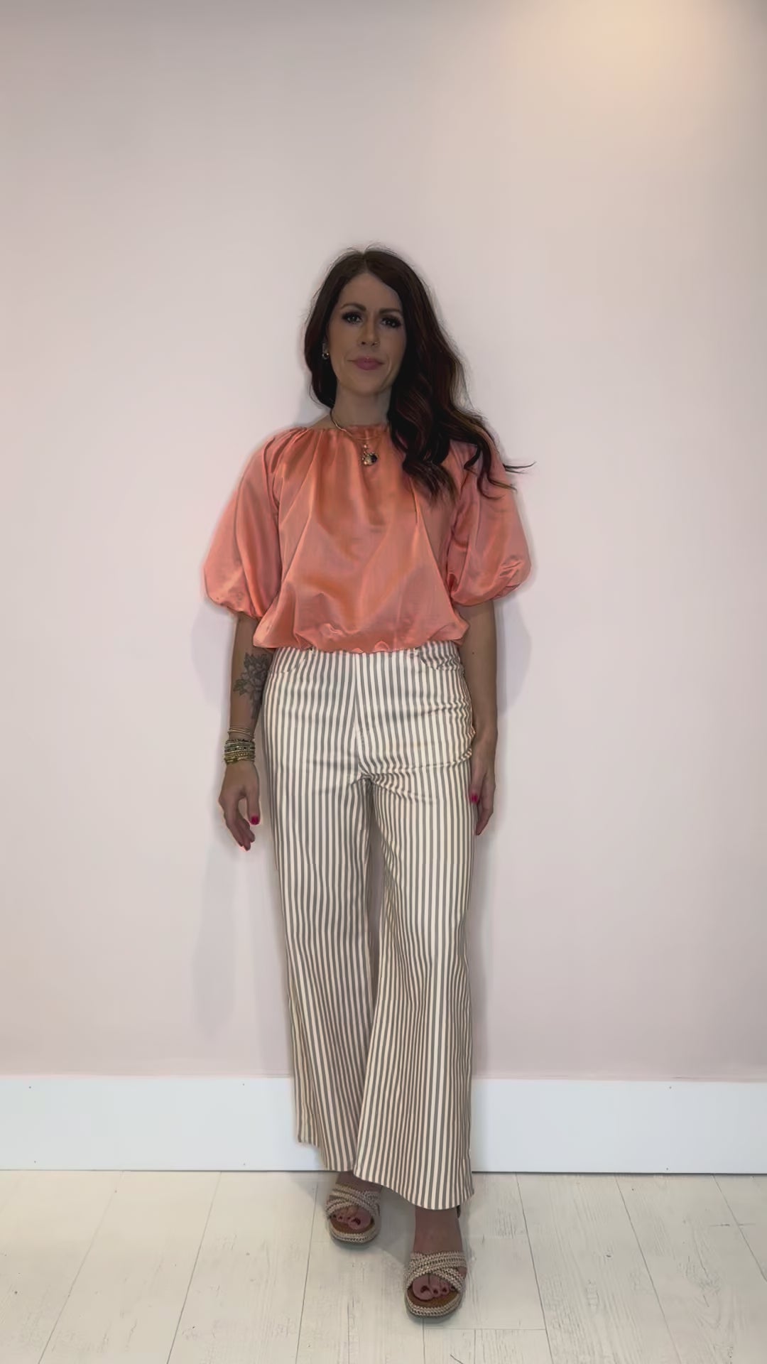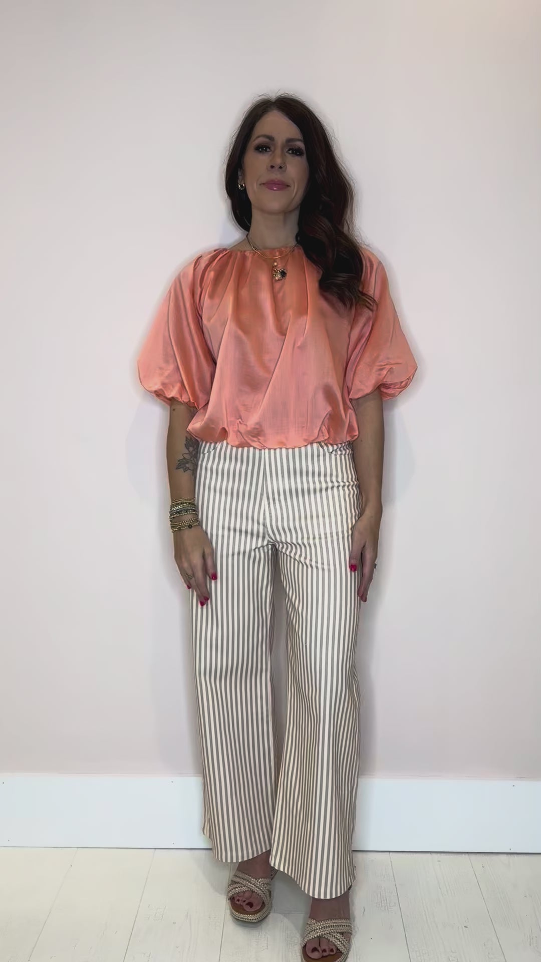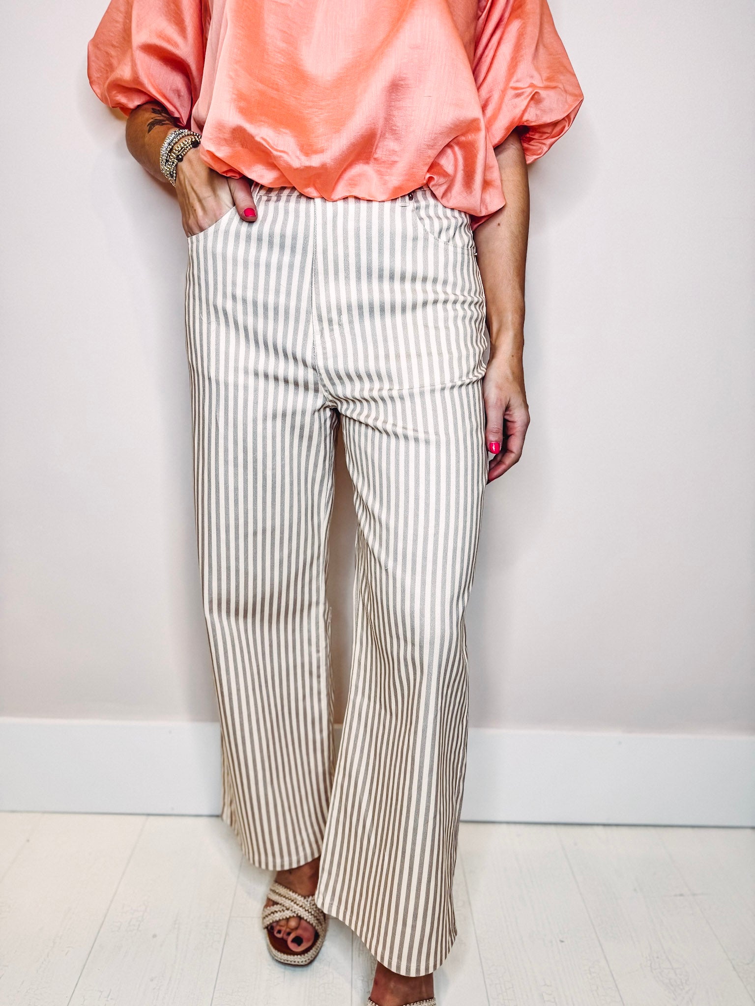 Stripes meet sophistication in these high-waisted wide-leg pants that effortlessly blend retro charm with modern style. The tan and white striped pattern adds visual interest while the relaxed silhouette flatters every frame. Perfect for creating bold, fashion-forward looks that feel both comfortable and put-together. Dress them up with heels or keep it casual with sneakers—these versatile pants are ready for anything.