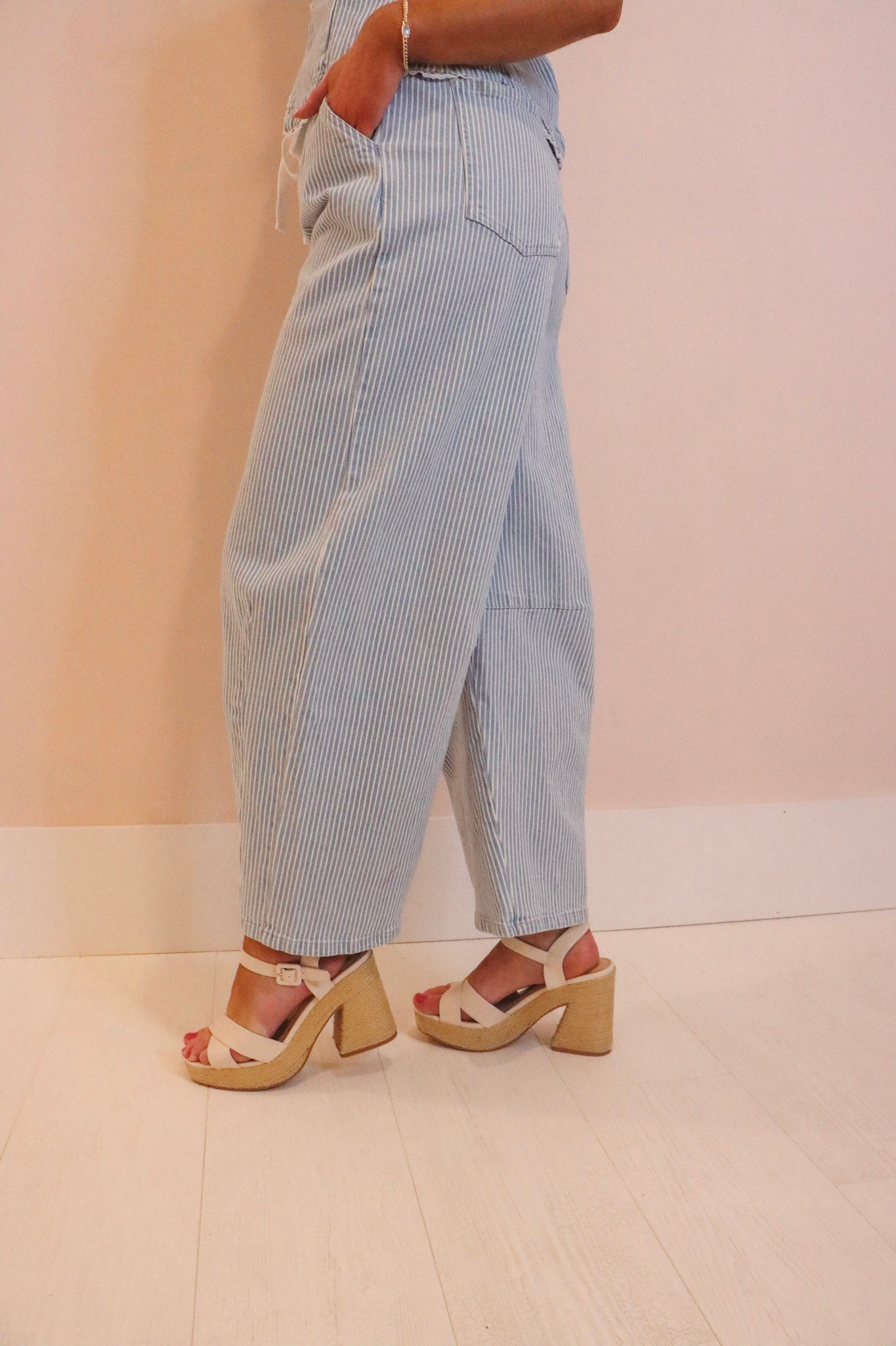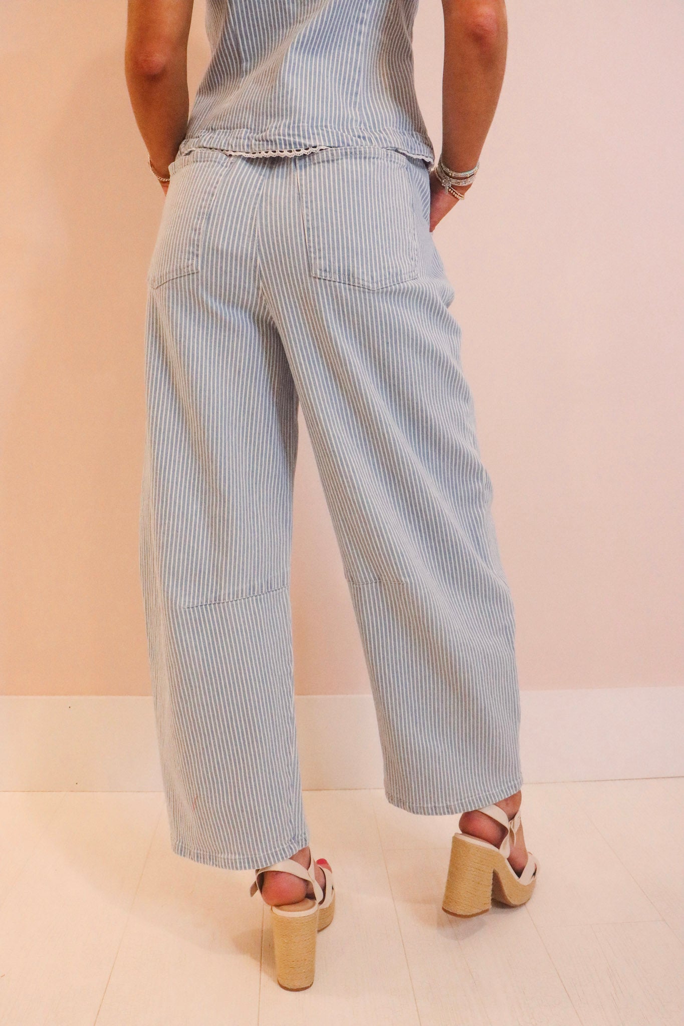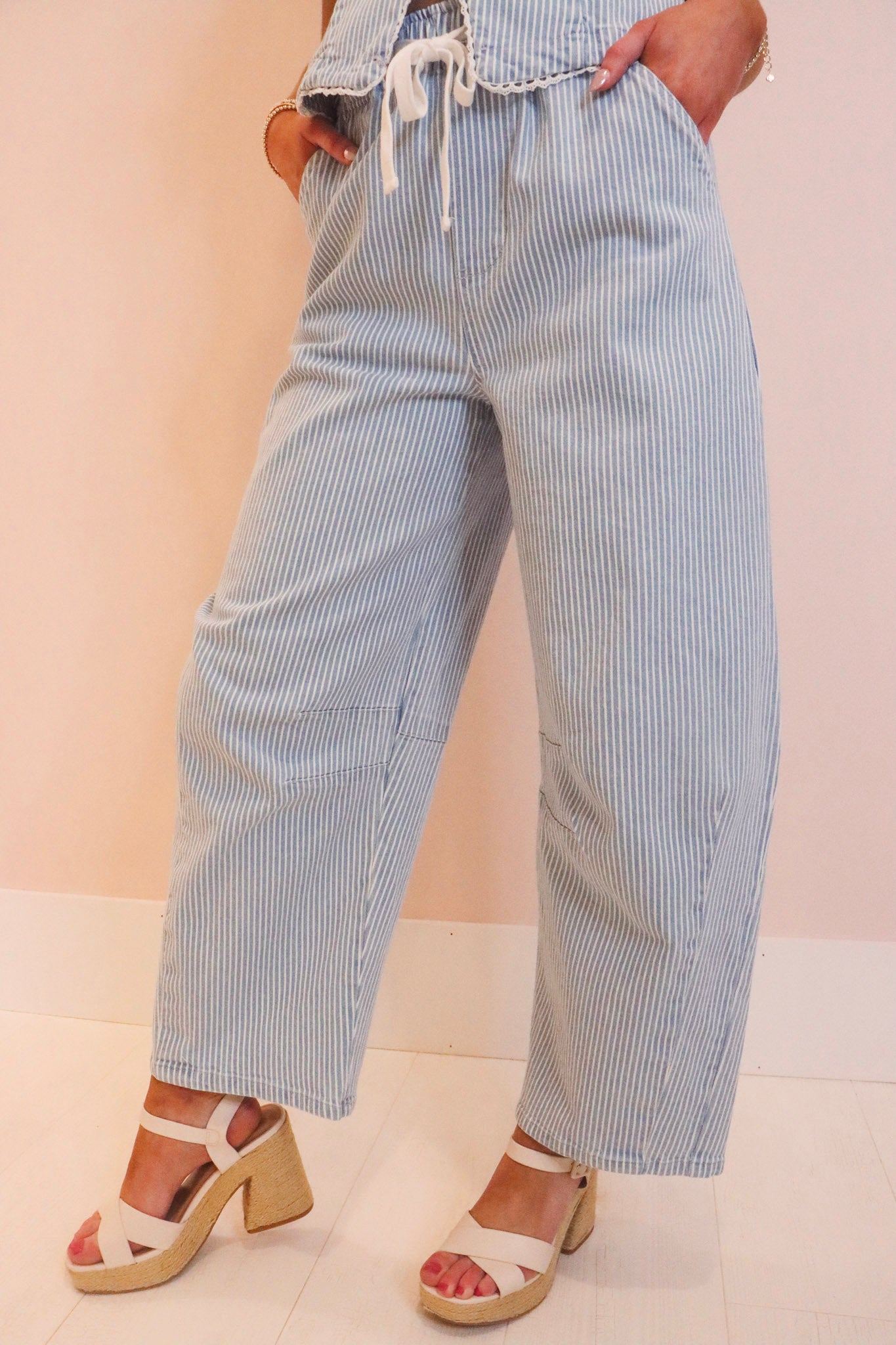 Meet your new go-to pant! These Indi Denim Washed Stripe Drawstring Pants feature a flattering barrel leg silhouette with an adjustable drawstring waist for the perfect fit every time. The crisp blue and white stripe pattern brings effortless charm to any outfit—throw them on with a tee for weekend vibes or dress them up for a night out. Versatile, comfortable, and undeniably cool, these pants are ready for whatever adventure comes your way.