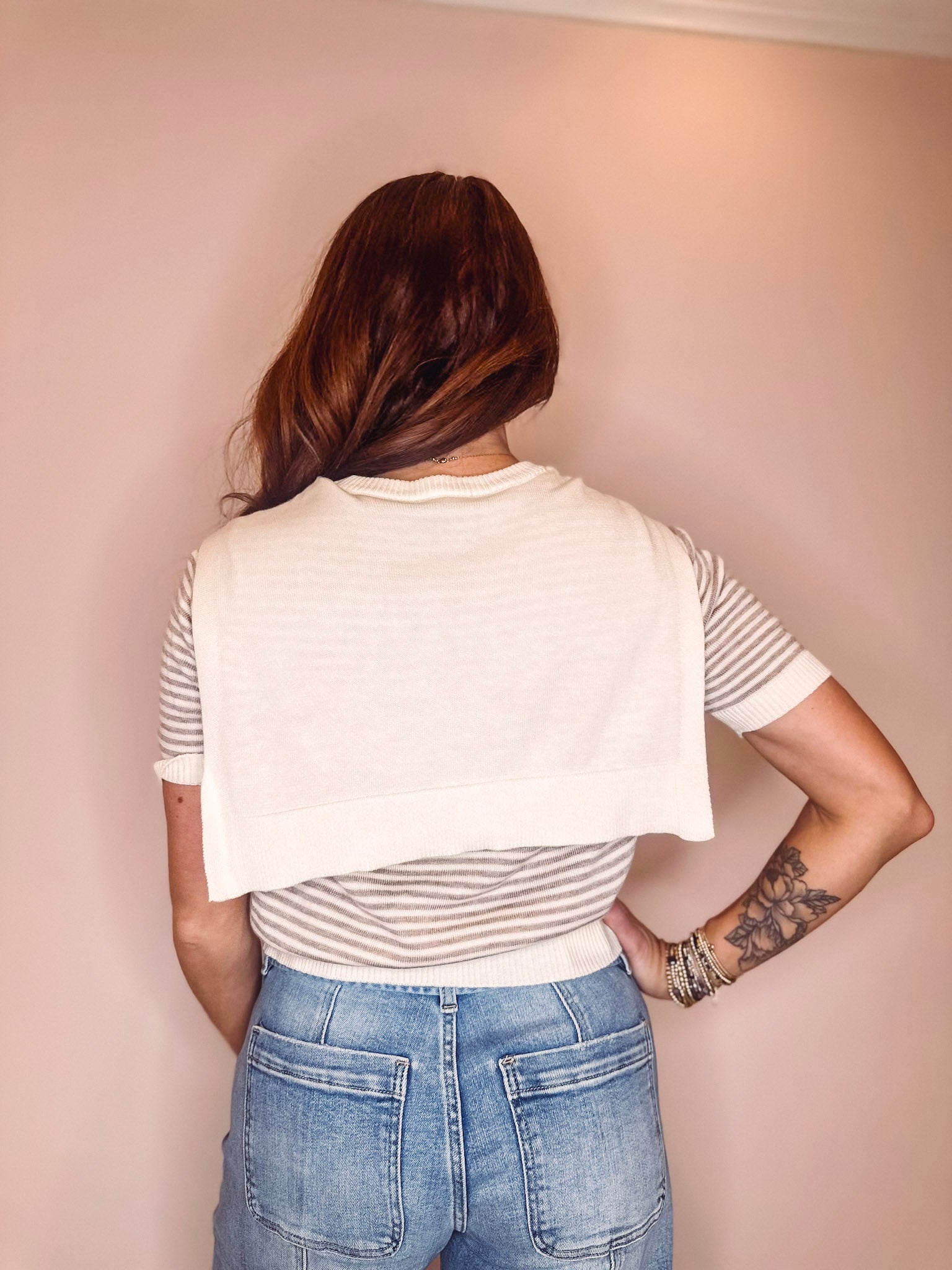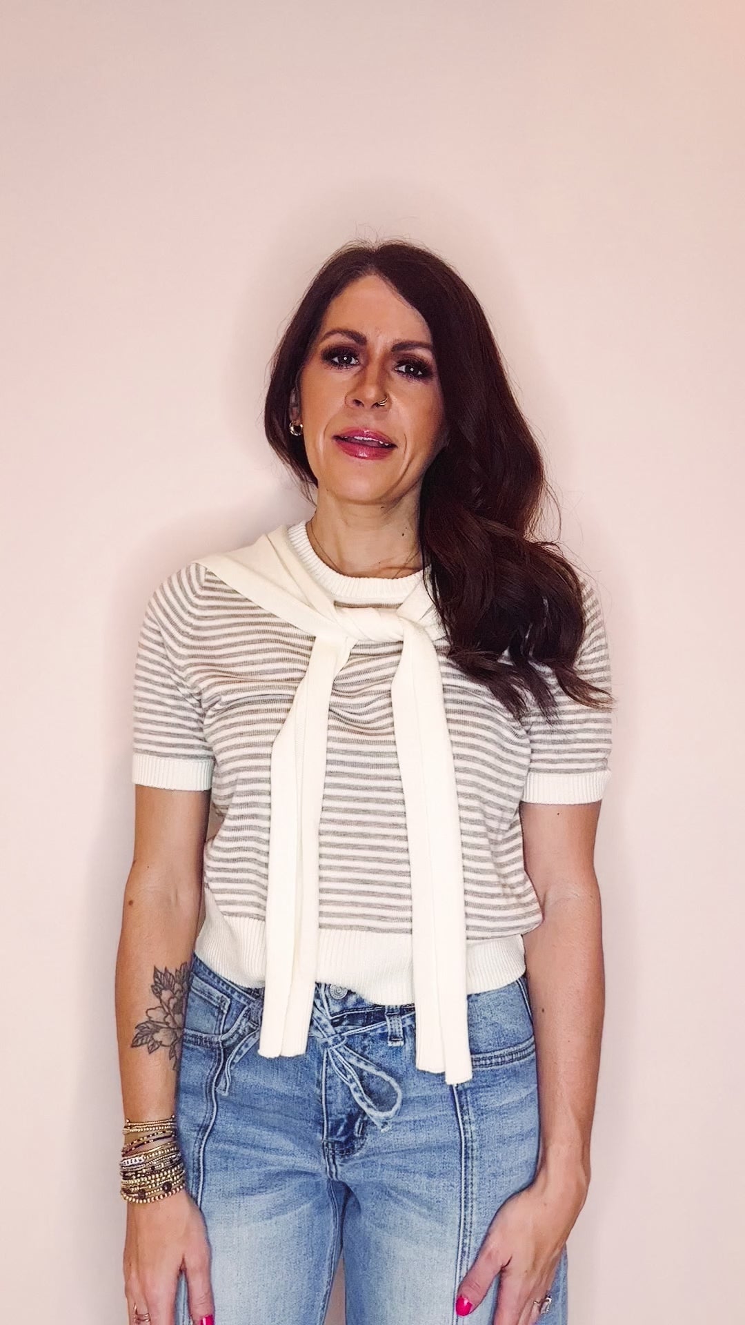 Effortlessly chic meets cozy comfort with the Kate Sweater. This lightweight rib knit features a charming cream and brown stripe pattern that pairs with everything in your closet. The playful mock sleeve tie detail adds a quirky twist, while the ribbed hem keeps things polished. Perfect for layering or wearing solo—your new go-to piece for casual sophistication with a wink.