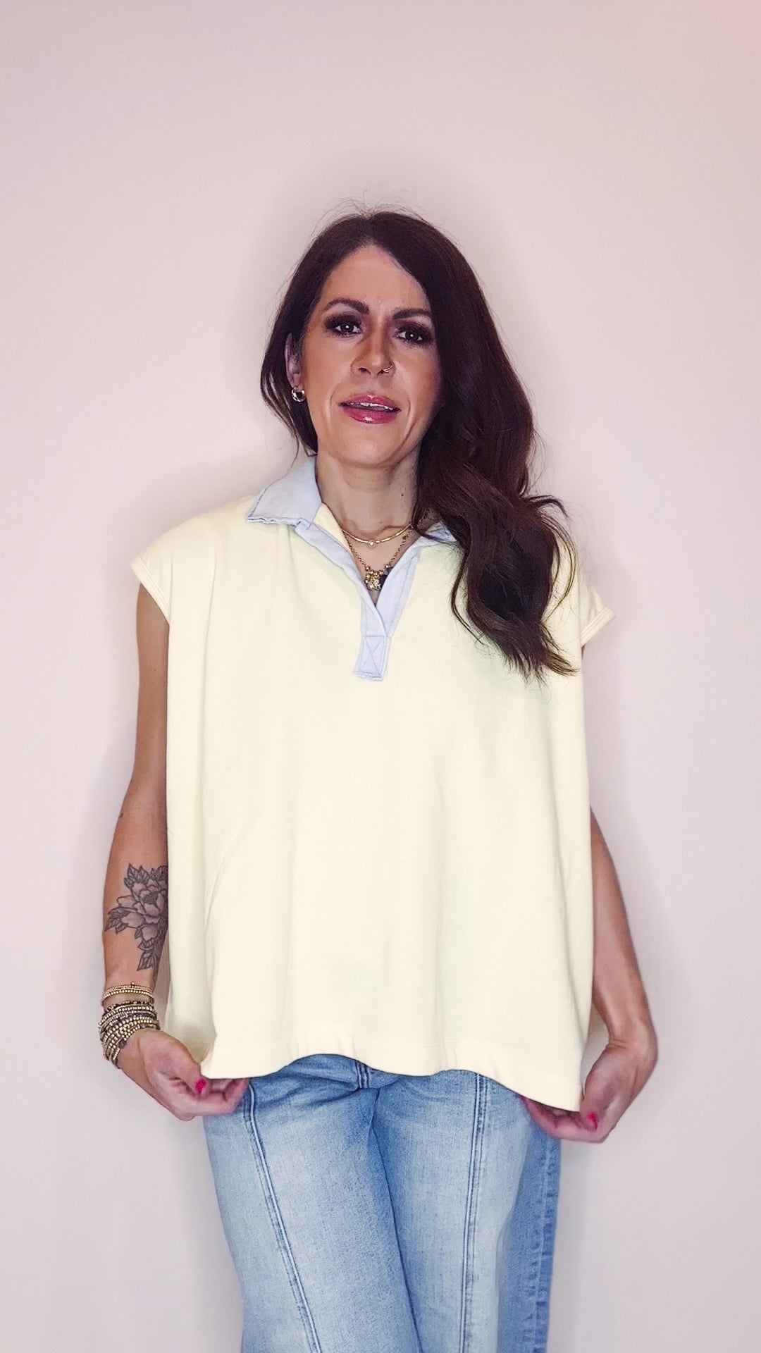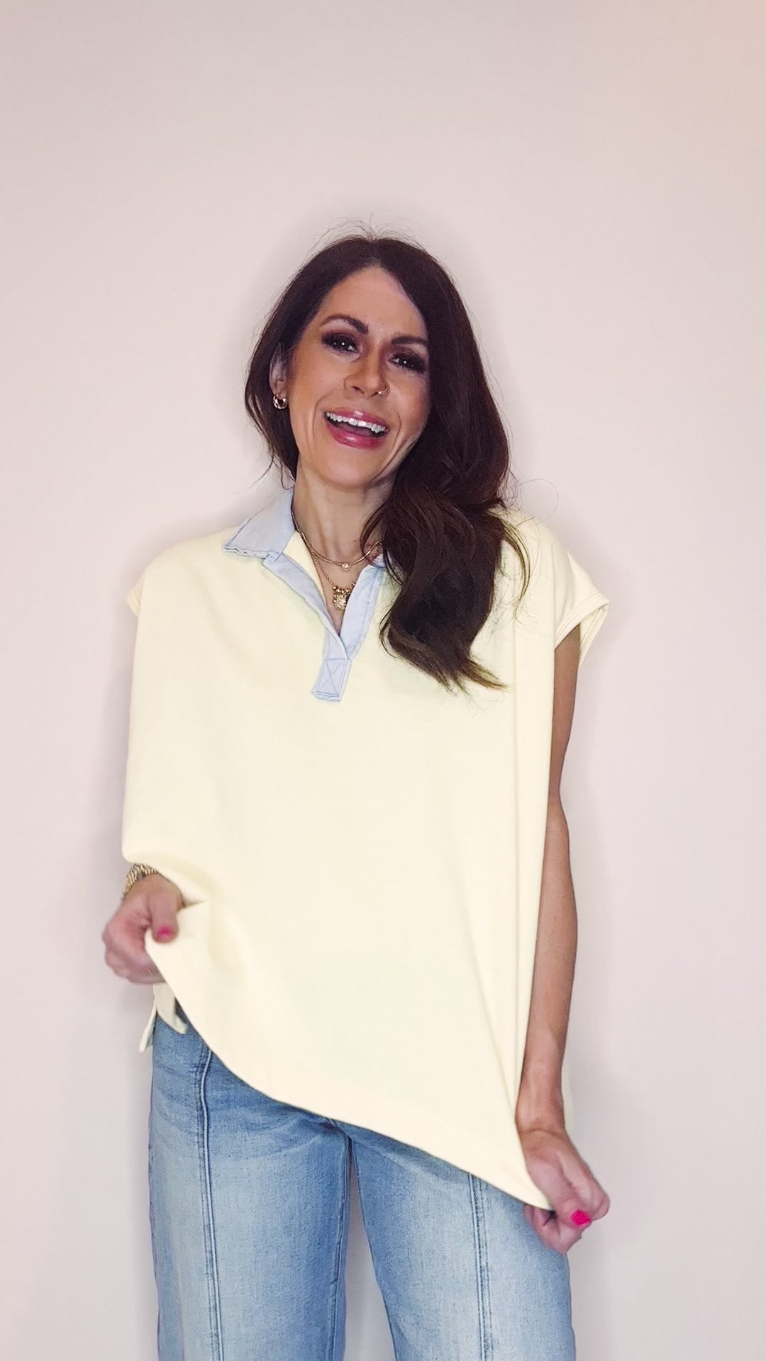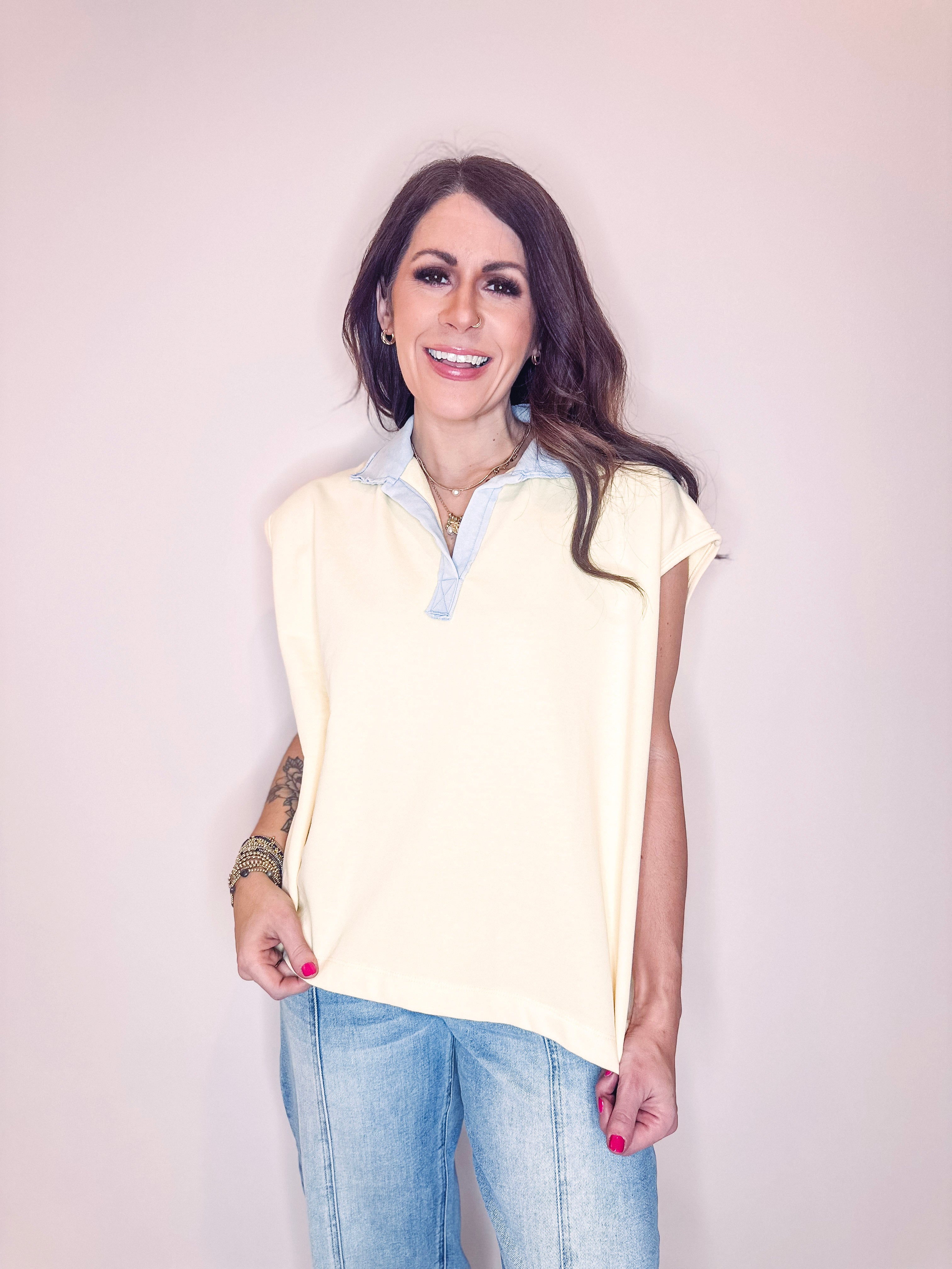 Stay cool and comfy in the Lucy Sweater Top, your new go-to for effortless style. This lightweight sleeveless wonder features a chic blue contrast collar that adds just the right pop of personality. Cut in an oversized, boxy silhouette, it's perfect for layering over tees or rocking solo when the weather warms up. Whether you're heading to brunch or keeping it casual, Lucy brings that perfect blend of relaxed vibes and put-together polish.