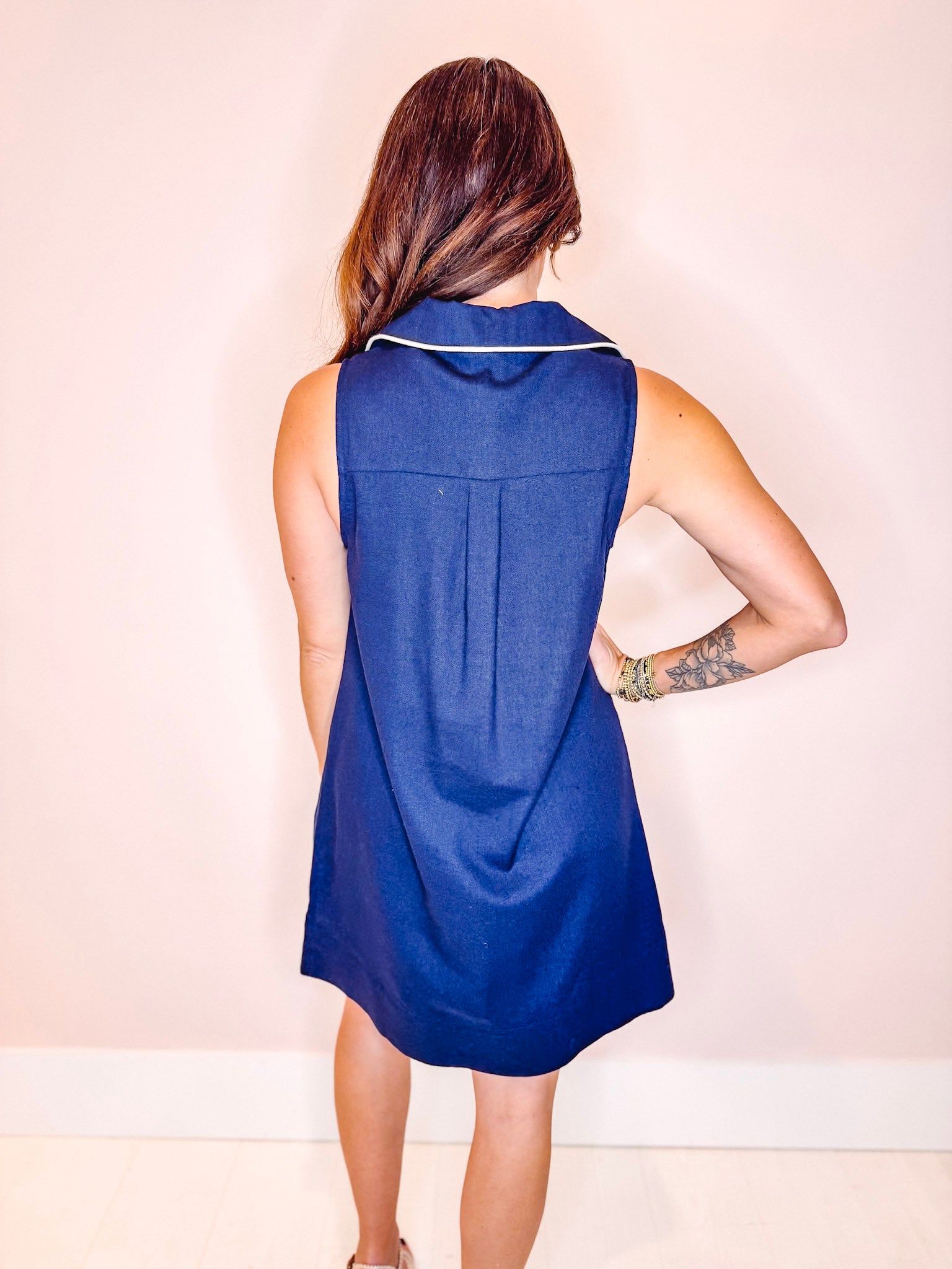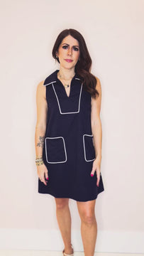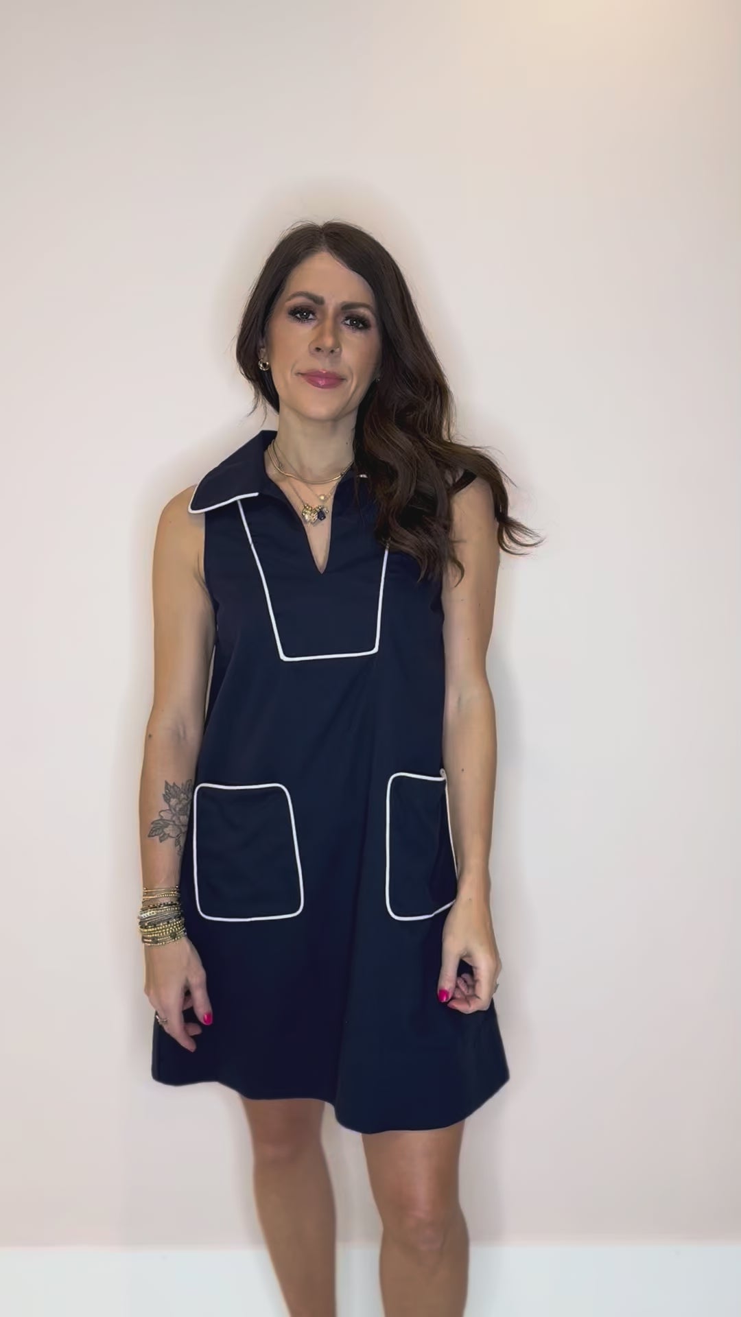 Step into retro charm with the Mia Vintage Inspired Mini Dress. This playful piece features a classic nave silhouette accented with crisp white trim that frames the neckline and sleeves beautifully. A functional pocket detail adds both style and practicality—because who doesn't love hidden storage? Perfect for channeling 1960s vibes with a modern twist, this mini dress is your go-to for vintage-inspired looks that feel fresh and fun.
