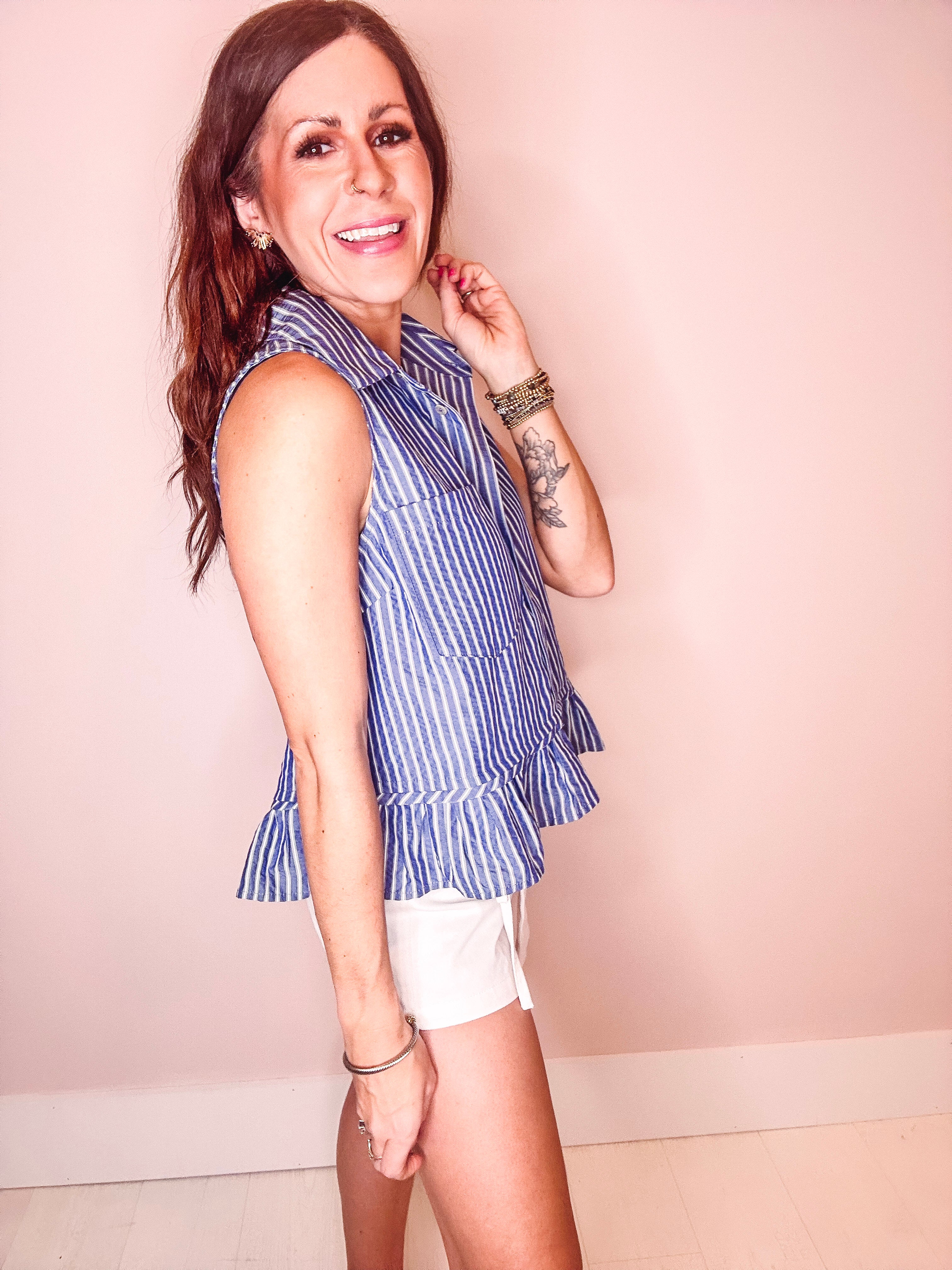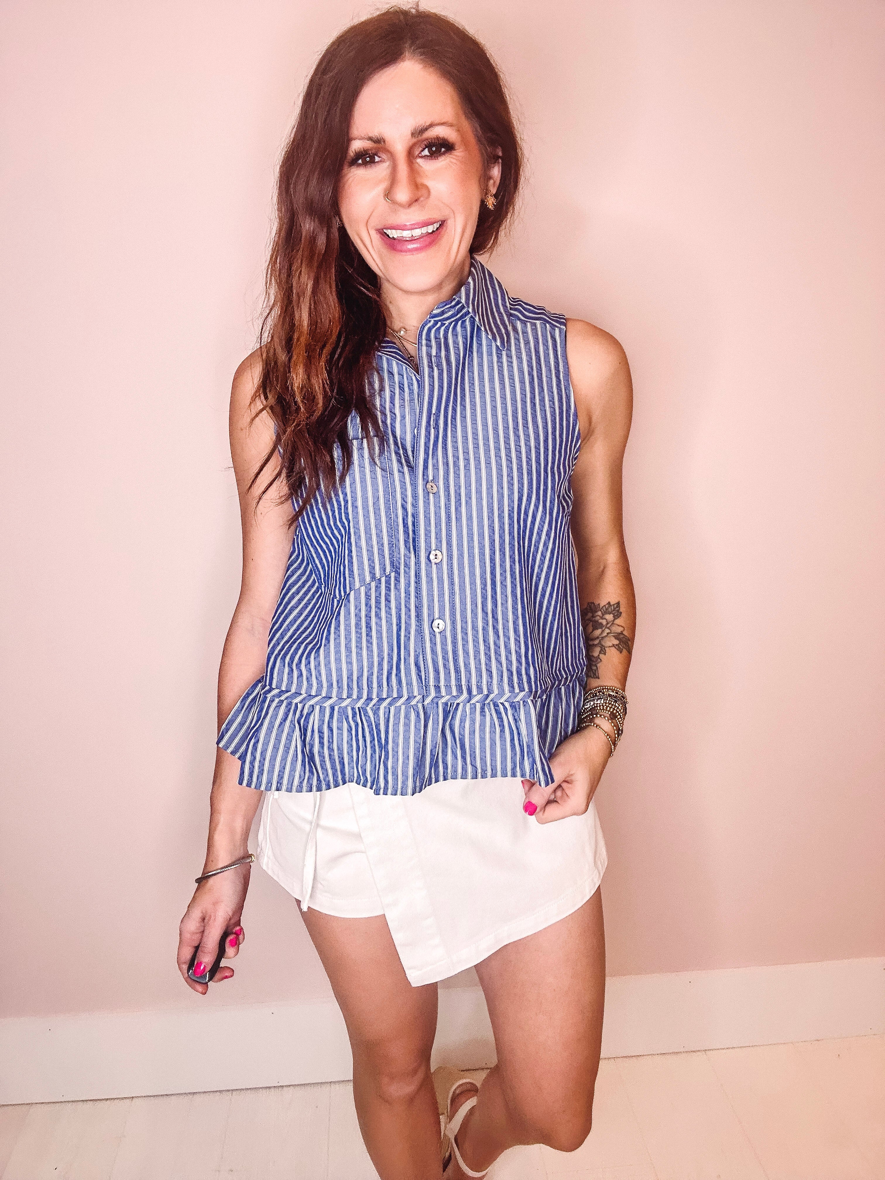 The Rebecca Frill Shirt brings effortless charm to your everyday rotation. This sleeveless button-front style features crisp navy and white stripes that pair with practically everything in your closet. The playful ruffled hem adds a flirty touch that elevates the classic striped pattern. Perfect for layering over tees or wearing solo on warmer days, this versatile piece transitions seamlessly from casual outings to weekend adventures.