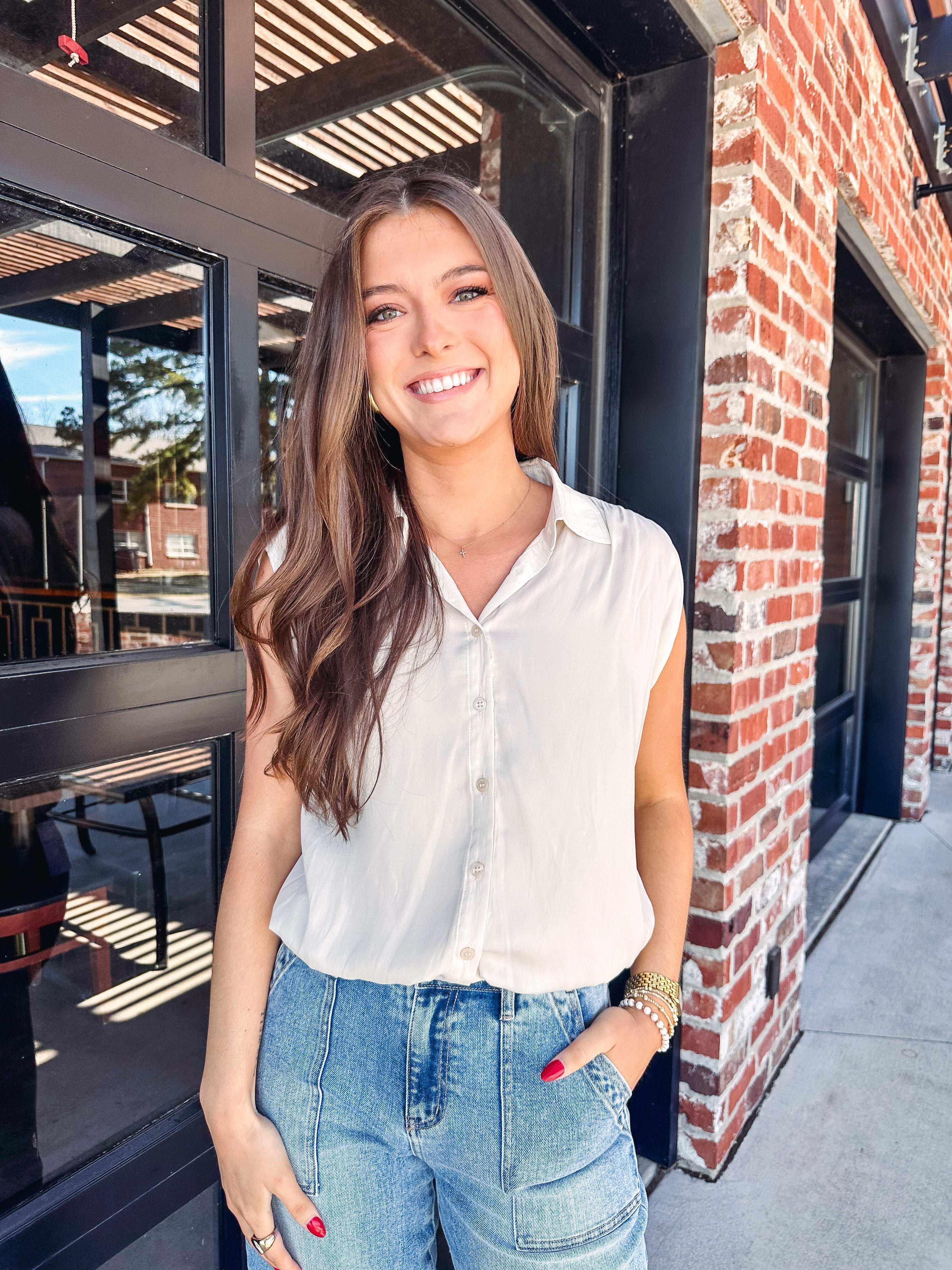 Effortlessly chic and wonderfully breezy, the Sofie Blouse brings a playful twist to your everyday wardrobe. This lightweight sleeveless button-down features a lustrous pearl finish that catches the light beautifully, while the charming bubble hem adds unexpected personality to a classic silhouette. Perfect for layering or wearing solo, it's your go-to piece for warm weather style that doesn't take itself too seriously.
