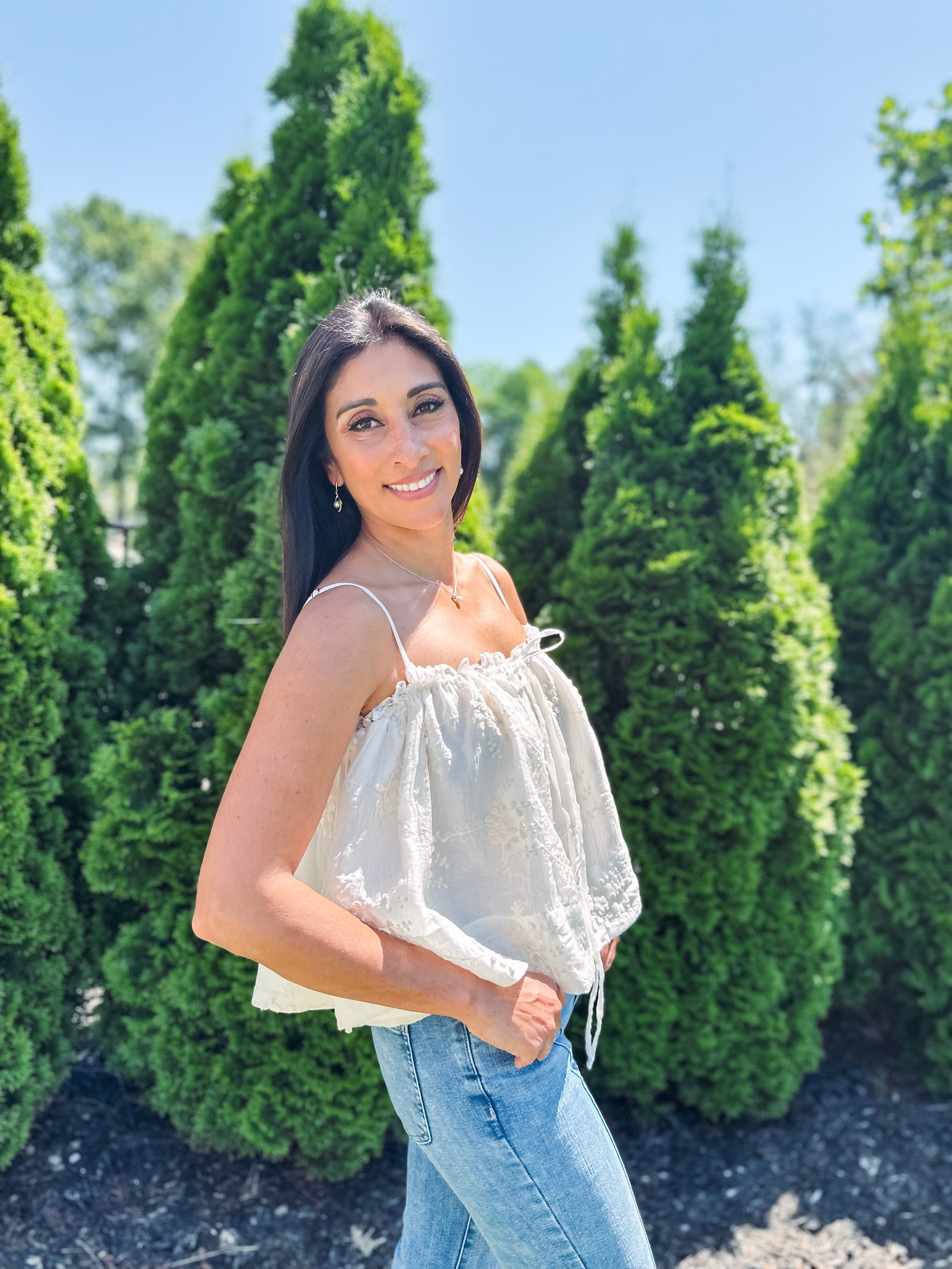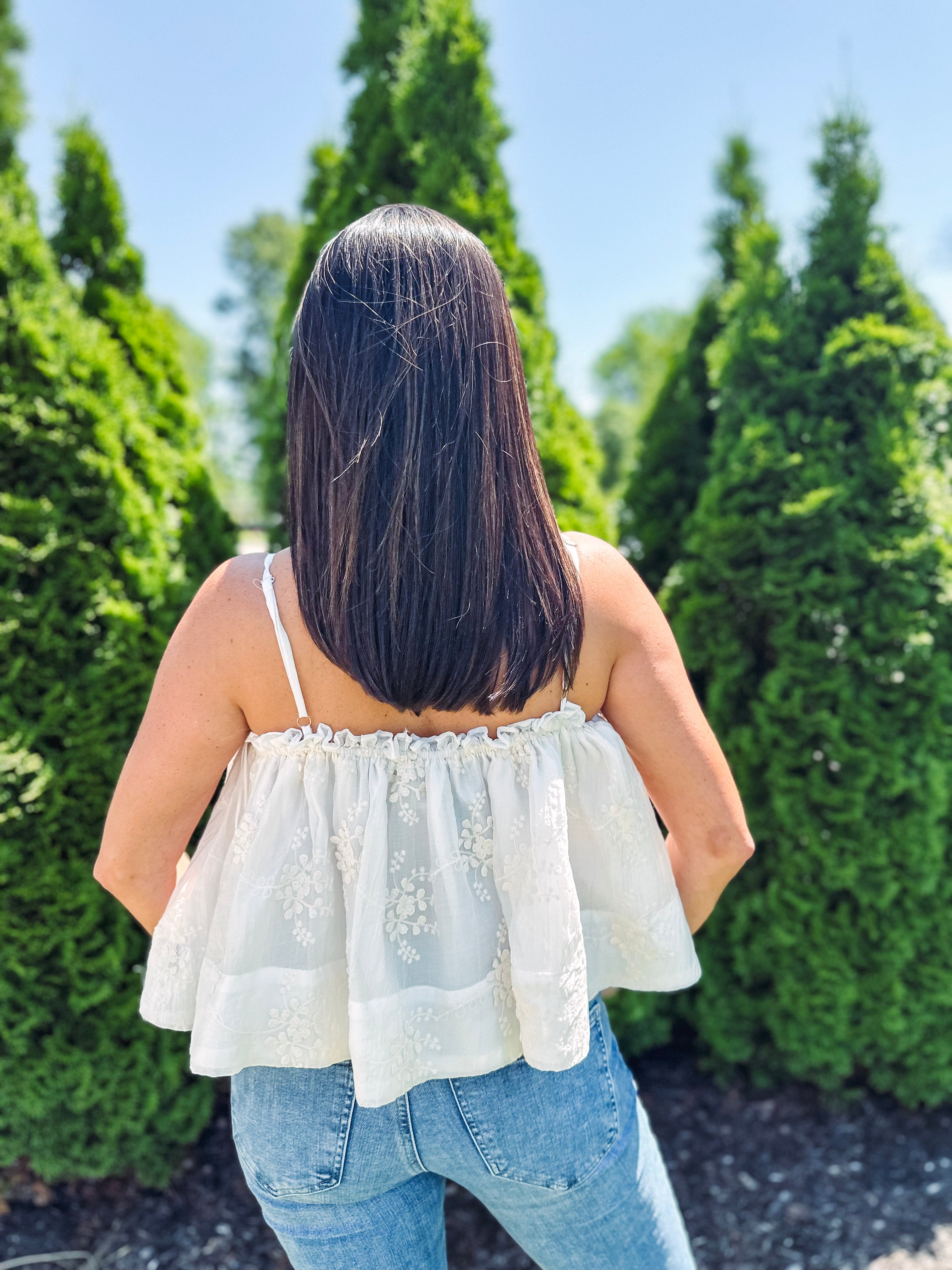 Release your inner girly-girl with our South of France Ruffled Camisole. This top features a playful bubble ruffle detail and flirty strappy camisole straps for a fun and flirty look. Perfect for any occasion, this camisole will have you feeling confident and cute!
