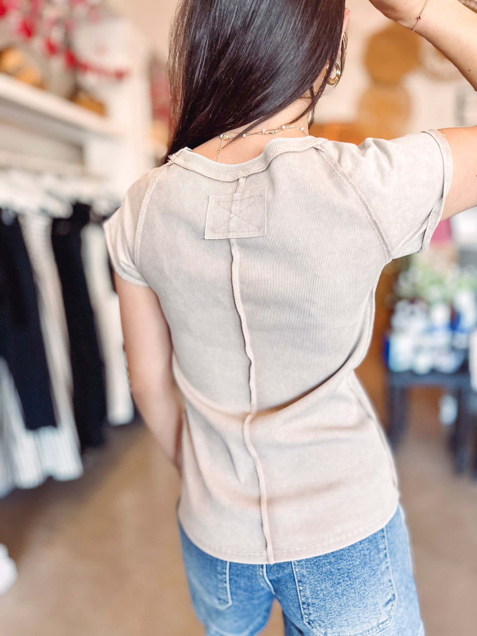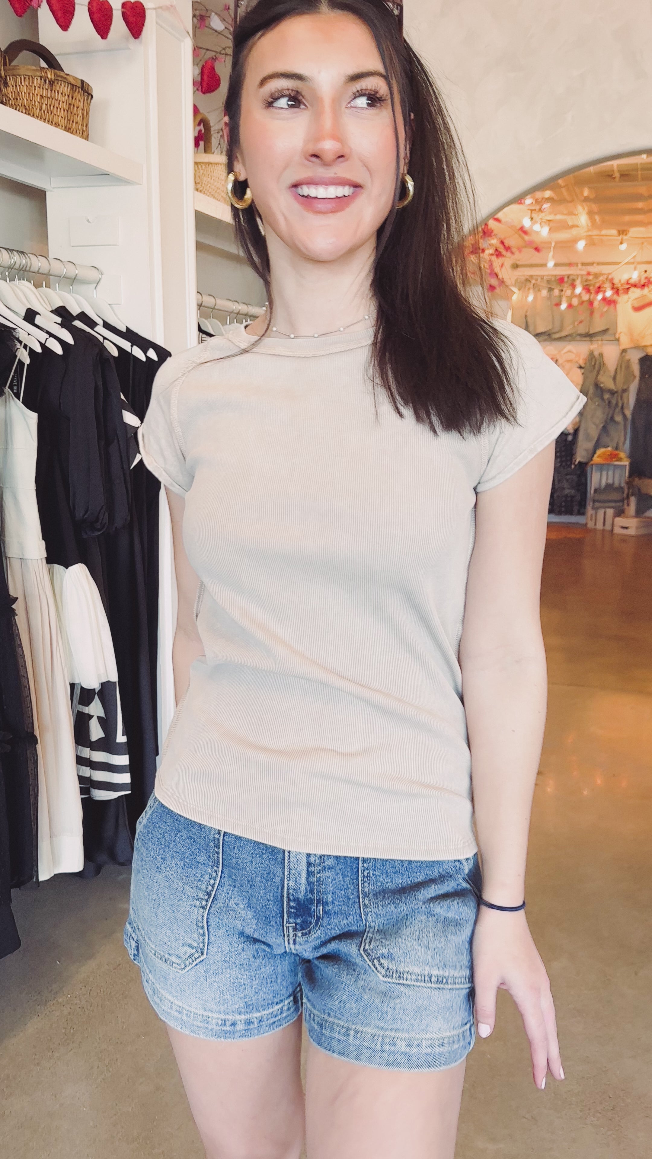 Effortless style meets comfort in this khaki baby rib tee. Featuring cap sleeves and raw edge seams for that perfectly undone vibe, it's the ultimate wardrobe essential. Dress it down with your favorite jeans or pair it with a bubble skirt for an instant mood boost. Simple, versatile, and oh-so-wearable.