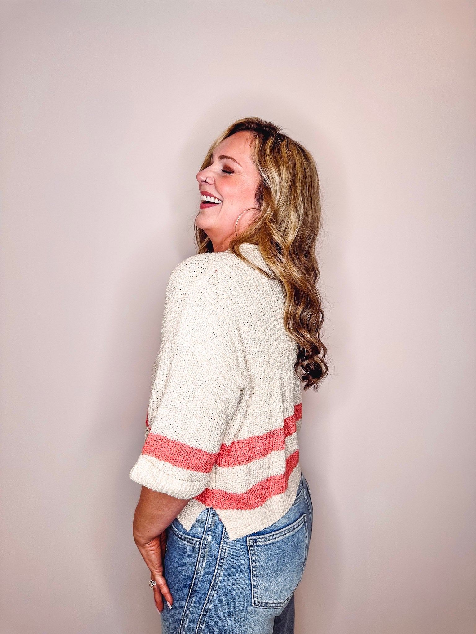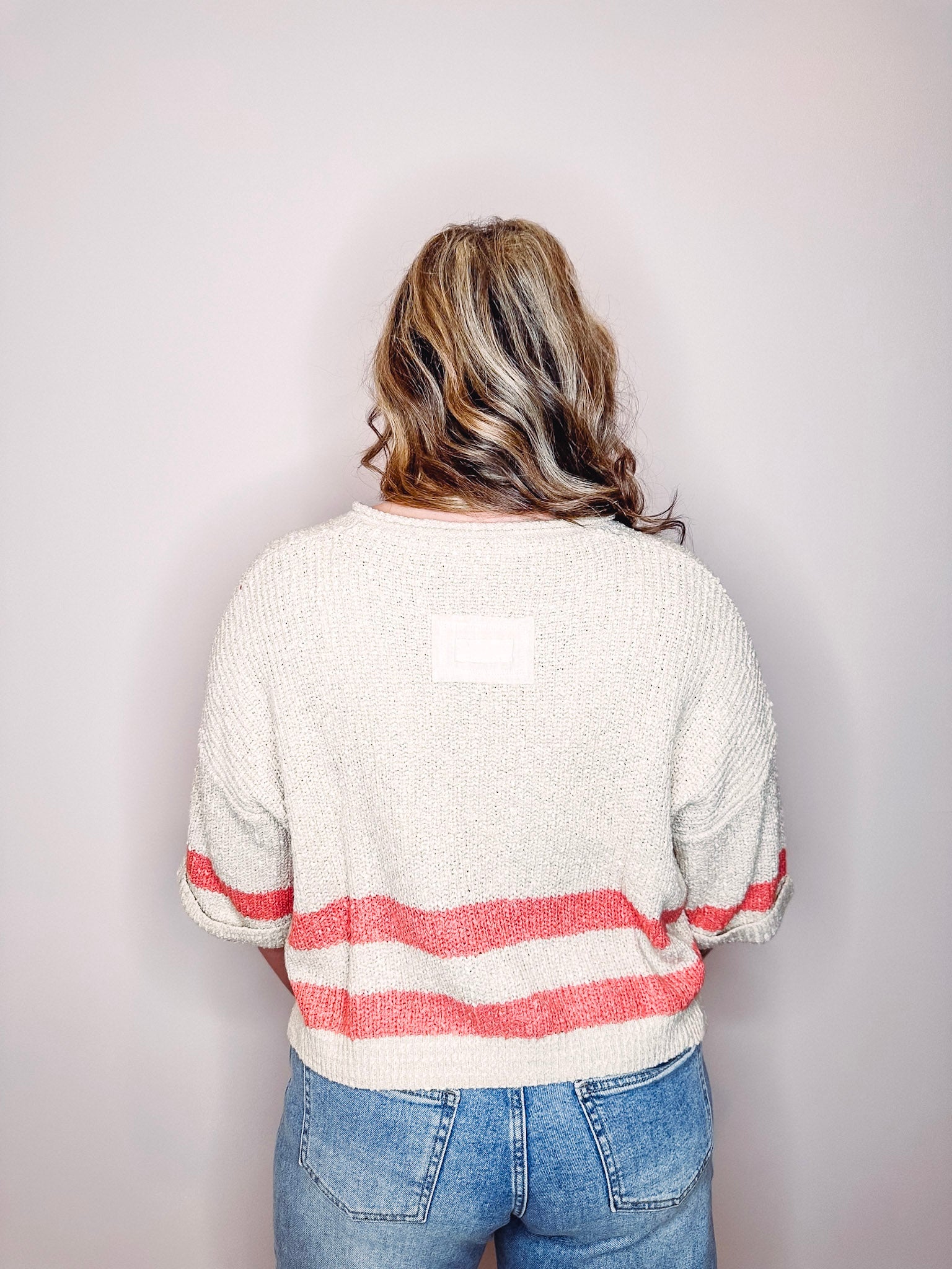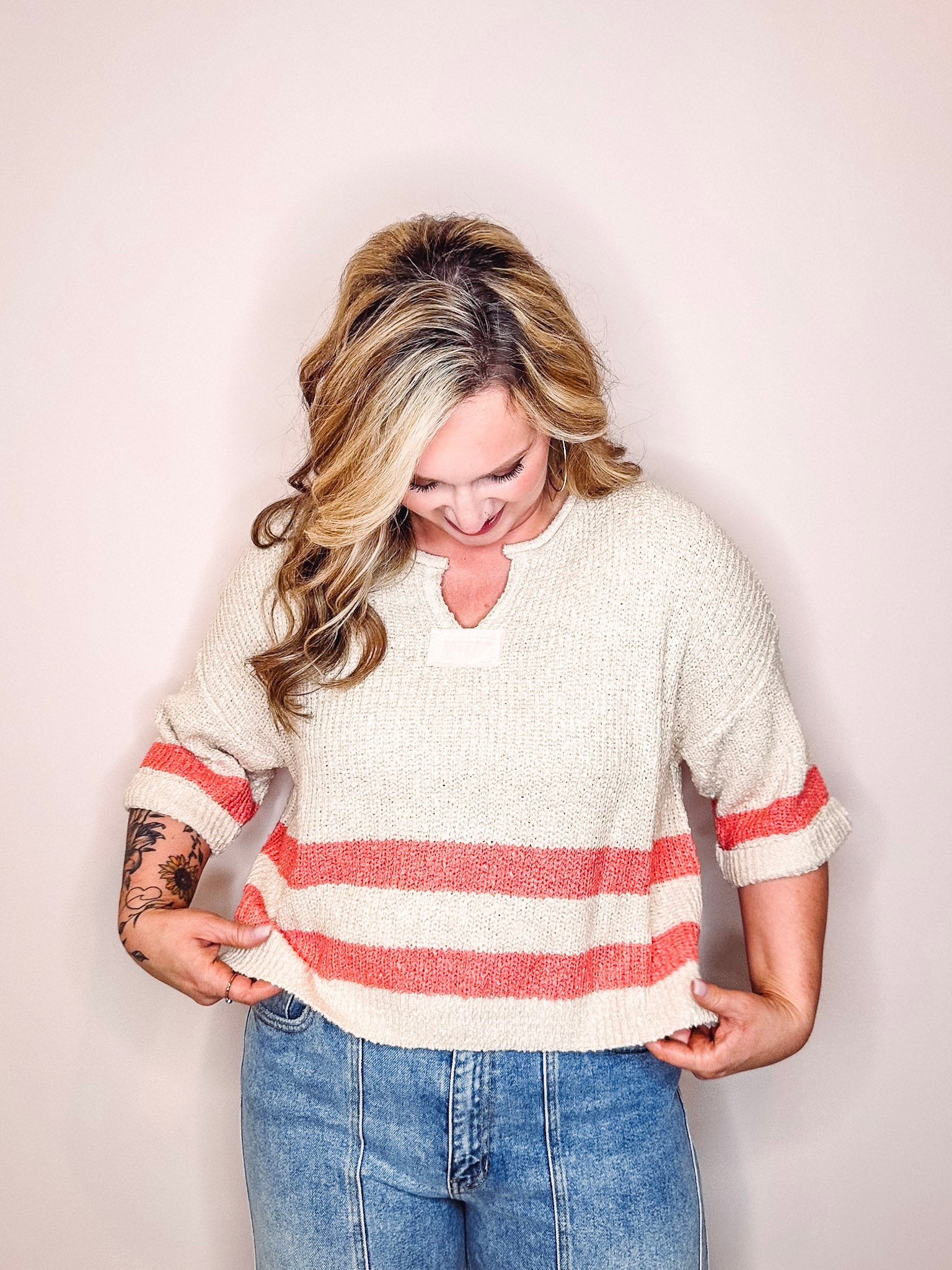 Cozy up in this playful cropped sweater that brings the warmth of a sunset to your wardrobe. Crafted from a substantial heavy knit, it features a chic beige base with a vibrant orange stripe detail running across the bodice and arms for that perfect pop of color. The notched neckline and rolled collar add a sophisticated touch that's anything but boring. Perfect for layering or wearing solo, this piece strikes the ideal balance between comfort and style—because who says cozy can't be fun?