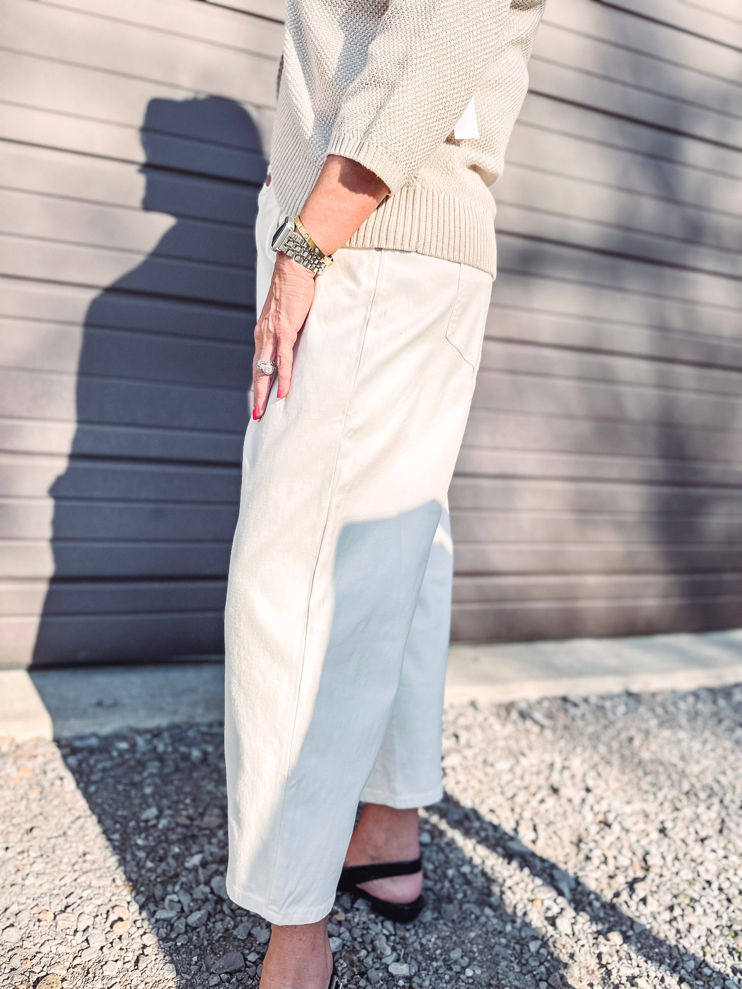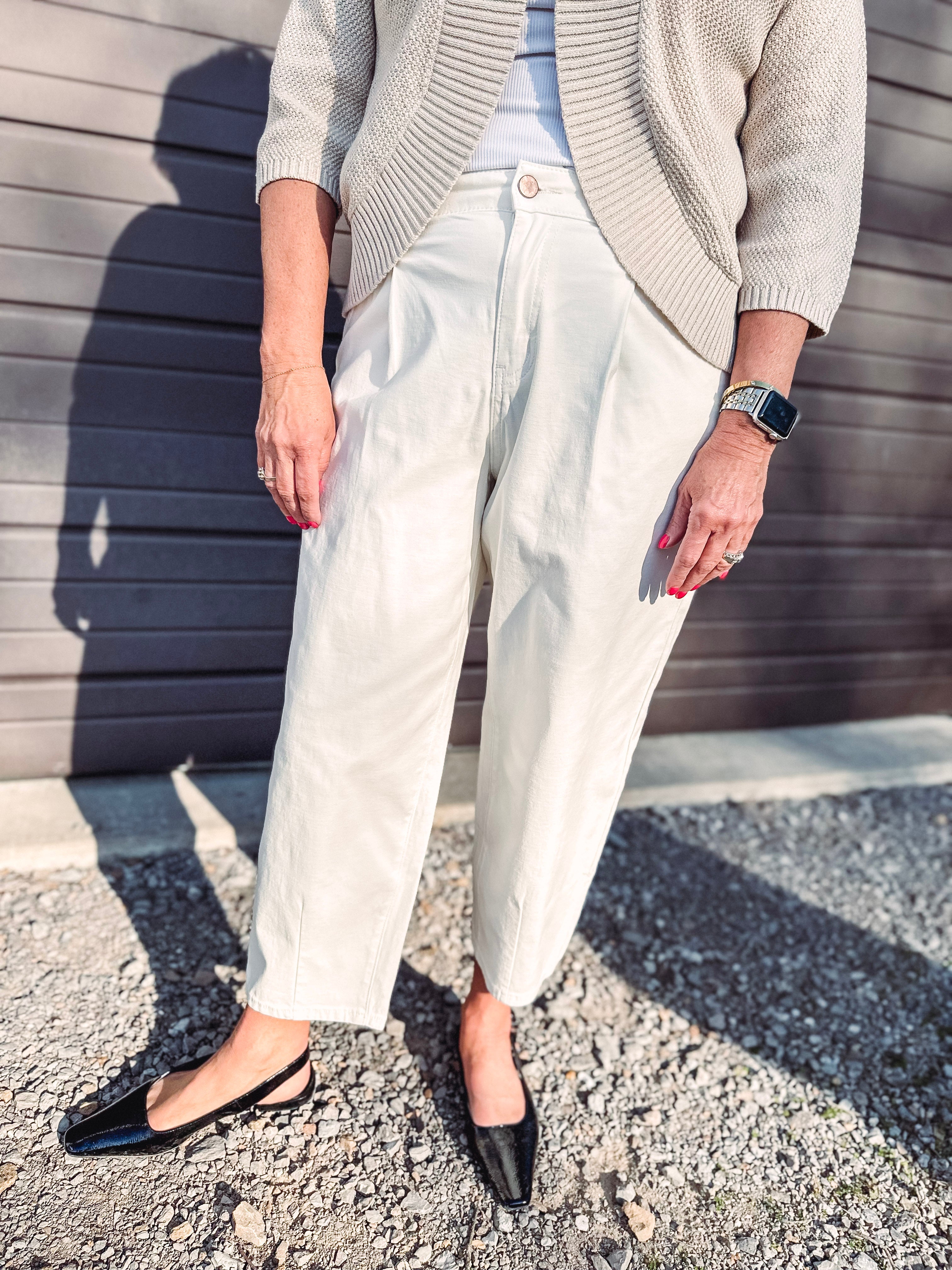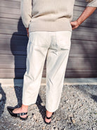 Unleash your carefree vibe with the Tribal Audrey Mid-Rise Girlfriend Barrel Jeans. The creamy off-white color gives a refreshing touch to the relaxed fit and cropped length. Tapered legs with front pleat detail and darts add structure, while pockets offer convenient storage. Embrace laid-back elegance with these quirky, barrel-legged jeans.